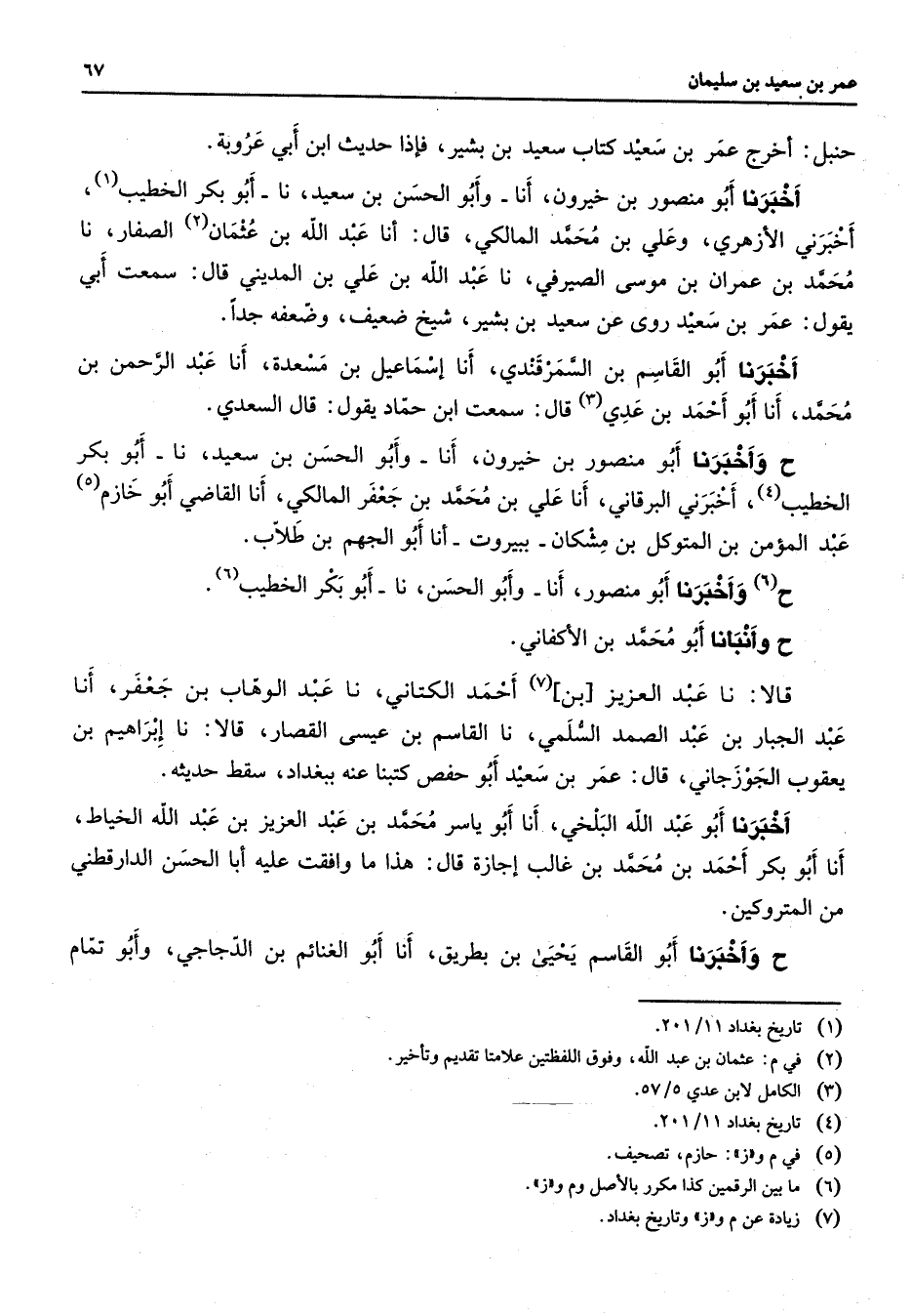 حنبل أخرج عمر بن سعيد كتاب سعيد بن بشر فإذا حديث ابن أبي عروبة أخبرنا أبو منصور بن خيرون أنا وأبو الحسن بن سعيد نا أبو بكر الخطيب (1) أخبرني الأزهري وعلي بن محمد المالكي قال أنا عبد الله بن عثمان (2) الصفار نا محمد بن عمران بن موسى الصيرفي نا عبد الله بن علي بن المديني قال سمعت أبي يقول عمر بن سعيد روى عن سعيد بن بشير شيخ ضعيف وضعفه جدا أخبرنا أبو القاسم بن السمرقندي أنا إسماعيل بن مسعدة أنا عبد الرحمن بن محمد أنا أبو أحمد بن عدي (4) قال سمعت ابن حماد يقول قال السعدي ح وأخبرنا أبو منصور بن خيرون أنا وأبو الحسن بن سعيد نا أبو بكر الخطيب (4) أخبرني البرقاني أنا علي بن محمد بن جعفر المالكي أنا القاضي أبو خازم عبد المؤمن بن المتوكل بن مشكان ببيروت أنا أبو الجهم بن طلاب ح (6) وأخبرنا أبو منصور أنا وأبو الحسن نا أبو بكر الخطيب (6) ح وأنبأنا أبو محمد بن الأكفاني قالا نا عبد العزيز بن (7) أحمد الكتاننا عبد الوهاب بن جعفر أنا عبد الجبار بن عبد الصمد السلمي نا القاسم بن عيسى القصار قالا نا إبراهيم بن يعقوب الجوزجاني قال عمر بن سعيد أبو حفص كتبنا عنه ببغداد سقط حديثه أخبرنا أبو عبد الله البلخي أنا أبو ياسر محمد بن عبد العزيز بن عبد الله الخياط أنا أبو بكر أحمد بن محمد بن غالب إجازة قال هذا ما وافقت عليه أبا الحسن الدارقطني من المتروكين ح وأخبرنا أبو القاسم يحيى بن بطريق أنا أبو الغنائم بن الدجاجي وأبو تمام