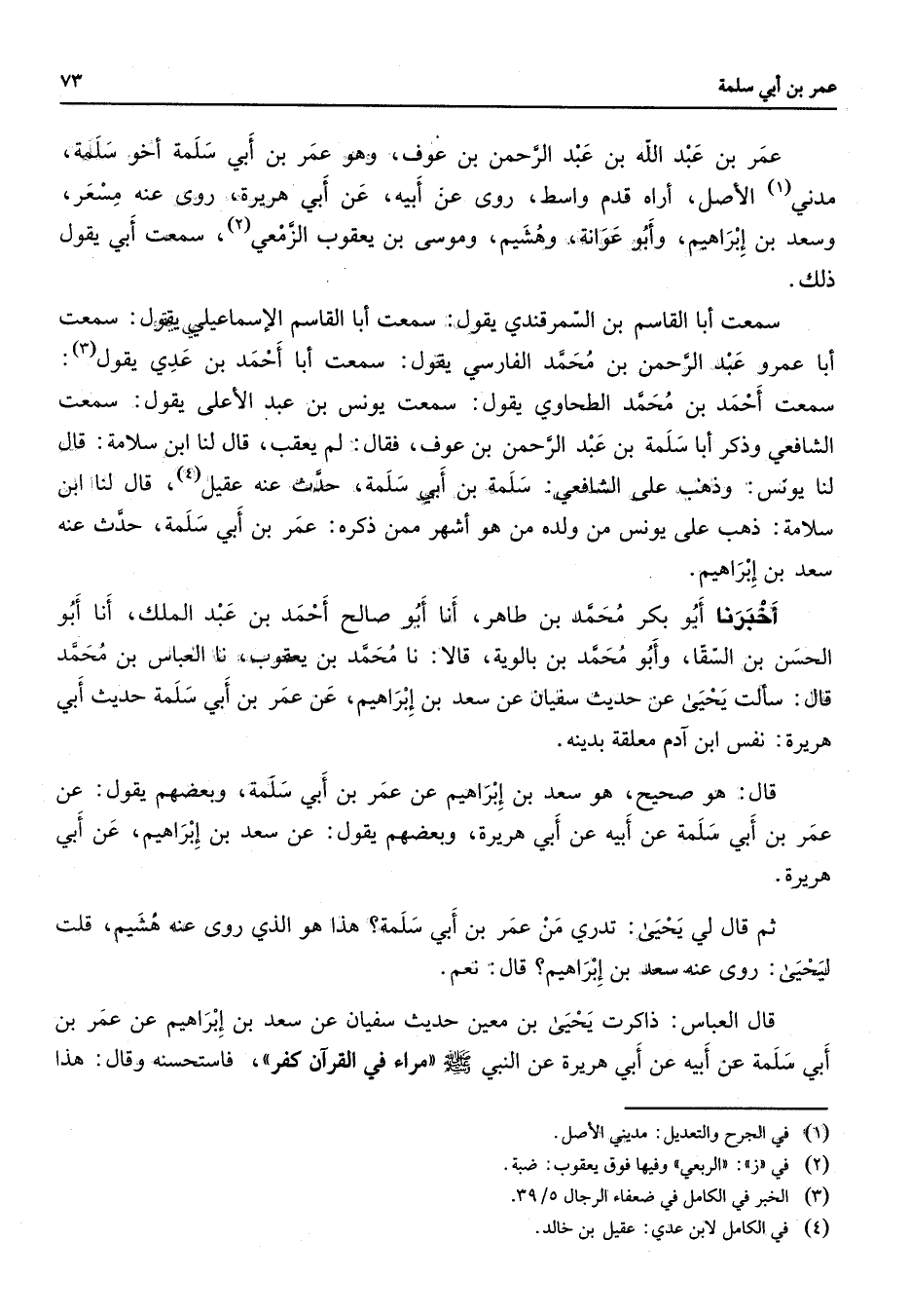 عمر بن عبد الله بن عبد الرحمن بن عوف وهو عمر بن أبي سلمة أخو سلمة مدني (1) الأصل أراه قدم واسط روى عن أبيه عن أبي هريرة روى عنه مسعر وسعد بن إبراهيم وأبو عوانة وهشيم وموسى بن يعقوب الزمعي (2) سمعت أبي يقول ذلك سمعت أبا القاسم بن السمرقندي يقول سمعت أبا القاسم الإسماعيلي يقول سمعت أبا عمرو عبد الرحمن بن محمد الفارسي يقول سمعت أبا أحمد بن عدي يقول (3) سمعت أحمد بن محمد الطحاوي يقول سمعت يونس بن عبد الأعلى يقول سمعت الشافعي وذكر أبا سلمة بن عبد الرحمن بن عوف فقال لم يعقب قال لنا ابن سلامة قال لنا يونس وذهب على الشافعي سلمة بن أبي سلمة حدث عنه عقيل (4) قال لنا ابن سلامة ذهب على يونس من ولده من هو أشهر ممن ذكره عمر بن أبي سلمة حدث عنه سعد بن إبراهيم أخبرنا أبو بكر محمد بن طاهر أنا أبو صالح أحمد بن عبد الملك أنا أبو الحسن بن السقا وأبو محمد ببالوية قالا نا محمد بن يعقوب نا العباس بن محمد قال سألت يحيى عن حديث سفيان عن سعد بن إبراهيم عن عمر بن أبي سلمة حديث أبي هريرة نفس ابن آدم معلقة بدينه قال هو صحيح هو سعد بن إبراهيم عن عمر بن أبي سلمة وبعضهم يقول عن عمر بن أبي سلمة عن أبيه عن أبي هريرة وبعضهم يقول عن سعد بن إبراهيم عن أبي هريرة ثم قال لي يحيى تدري من عمر بن أبي سلمة هذا هو الذي روى عنه هشيم قلت ليحيى روى عنه سعد بن إبراهيم قال نعم قال العباس ذاكرت يحيى بن معين حديث سفيان عن سعد بن إبراهيم عن عمر بن أبي سلمة عن أبيه عن أبي هريرة عن النبي (صلى الله عليه وسلم) مراء في القرآن كفر فاستحسنه وقال هذا