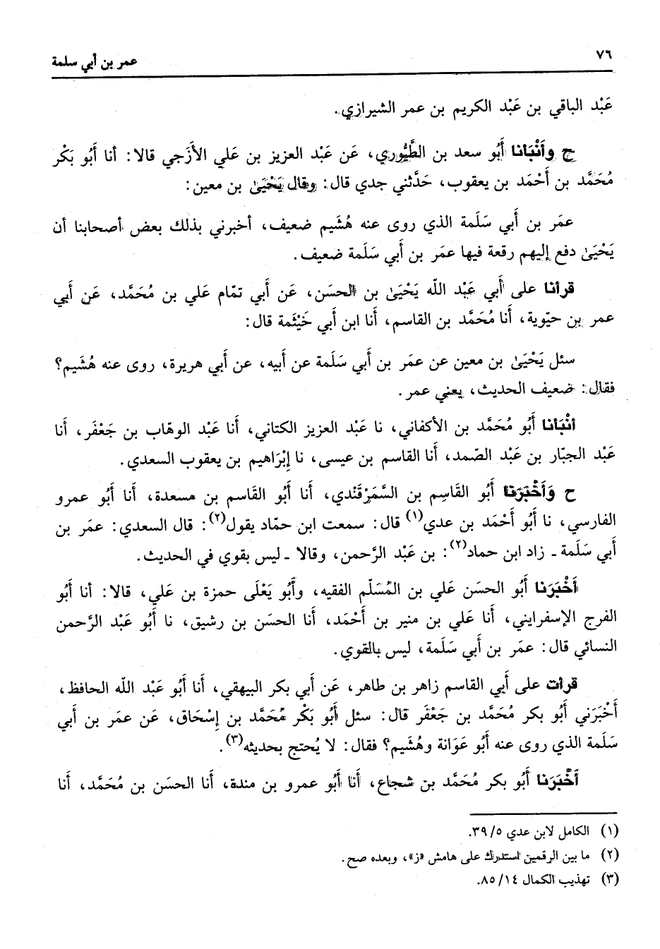 عبد الباقي بن عبد الكريم بن عمر الشيرازي ح وأنبأنا أبو سعد بن الطيوري عن عبد العزيز بن علي الأزجي قالا أنا أبو بكر محمد بن أحمد بن يعقوب حدثني جدي قال وقال يحيى بن معين عمر بن أبي سلمة الذي روى عنه هشيم ضعيف أخبرني بذلك بعض أصحابنا أن يحيى دفع إليهم رقعة فيها عمر بن أبي سلمة ضعيف قرأنا على أبي عبد الله يحيى بن الحسن عن أبي تمام علي بن محمد عن أبي عمر بن حيوية أنا محمد بن القاسم أنا ابن أبي خيثمة قال سئل يحيى بن معين عن عمر بن أبي سلمة عن أبيه عن أبي هريرة روى عنه هشيم فقال ضعيف الحديث يعني عمر أنبأنا أبو محمد بن الأكفاني نا عبد العزيز الكتاني أنا عبد الوهاب بن جعفر أنا عبد الجبار بن عبد الصمد أنا القاسم بن عيسى نا إبراهيم بن يعقوب السعدي ح وأخبرنا أبو القاسم بن السمرقندي أنا أبو القاسم بن مسعدة أنا أبو عمرو الفارسي نا أبو أحمد بن عدي (1) قال سمعت ابن حماد يقول (2) قال السعدي عمر بن أبي سلمة زاد ابن حماد (2) بن عبد الرحمن وقالا ليس بقوي في الحديث أخبرنا أبو الحسن علي بن المسلم الفقيه وأبو يعلى حمزة بن علي قالا أنا أبو الفرج الإسفرايني أنا علي بن منير بن أحمد أنا الحسن بن رشيق نا أبو عبد الرحمن النسائي قال عمر بن أبي سلمة ليس بالقوي قرأت على أبي القاسم زاهر بن طاهر عن أبي بكر البيهقي أنا أبو عبد الله الحافظ أخبرني أبو بكر محمد بن جعفر قال سئل أبو بكر محمد بن إسحاق عن عمر بن أبي سلمة الذي روى عنه أبو عوانة وهشيم فقال لا يحتج بحديثه (3) أخبرنا أبو بكر محمد بن شجاع أنا أبو عمرو بن مندة أنا الحسن بن محمد أنا