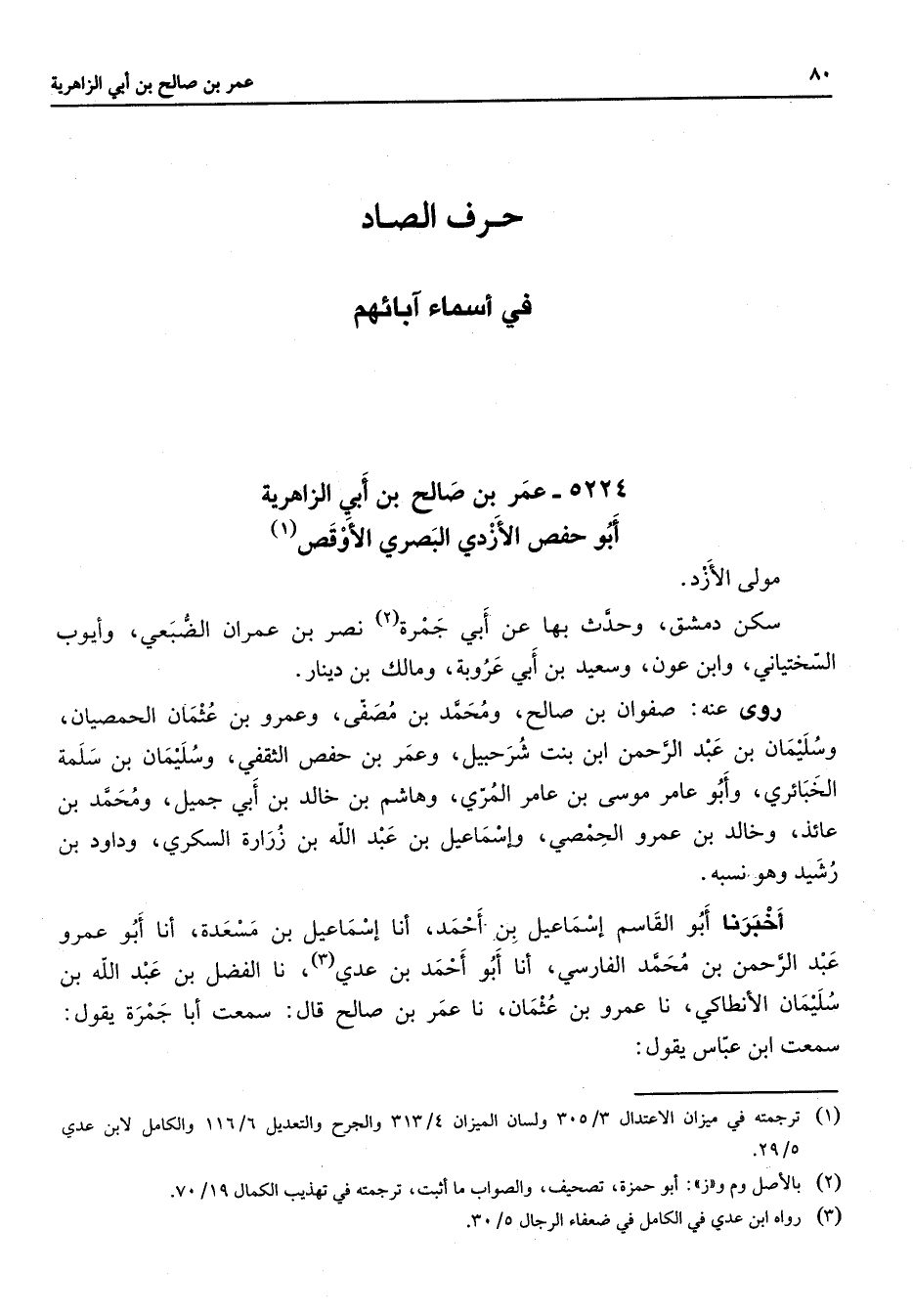 5224 - عمر بن صالح بن أبي الزاهرية أبو حفص الأزدي البصري الأوقص (1) مولى الأزد سكن دمشق وحدث بها عن أبي جمرة (2) نصر بن عمران الضبعي وأيوب السختياني وابن عون وسعيد بن أبي عروبة ومالك بن دينار روى عنه صفوان بن صالح ومحمد بن مصفى وعمرو بن عثمان الحمصيان وسليمان بن عبد الرحمن ابن بنت شرحبيل وعمر بن حفص الثقفي وسليمان بن سلمة الخبائري وأبو عامر موسى بن عامر المري وهاشم بن خالد بن أبي جميل ومحمد بن عائذ وخالد بن عمرو الحمصي وإسماعيل بن عبد الله بن زرارة السكري وداود بن رشيد وهو نسبه أخبرنا أبو القاسم إسماعيل بن أحمد أنا إسماعيل بن مسعدة أنا أبو عمرو عبد الرحمن بن محمد الفارسي أنا أبو أحمد بن عدي (3) نا الفضل بن عبد الله بن سليمان الأنطاكي نا عمرو بن عثمان نا عمر بن صالح قال سمعت أبا جمرة يقول سمعت ابن عباس يقول
