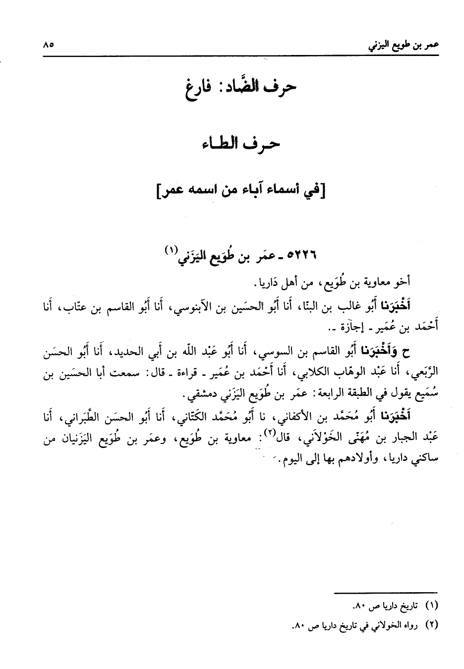 5226 - عمر بن طويع اليزني (1) أخو معاوية بن طويع أهل داريا أخبرنا أبو غالب بن البنا أنا أبو الحسين بن الآبنوسي أنا أبو القاسم بن عتاب أنا أحمد بن عمير إجازة ح وأخبرنا أبو القاسم بن السوسي أنا أبو عبد الله بن أبي الحديد أنا أبو الحسن الربعي أنا عبد الوهاب الكلابي أنا أحمد بن عمير قراءة قال سمعت أبا الحسين بن سميع يقول في الطبقة الرابعة عمر بن طويع اليزني دمشقي أخبرنا أبو محمد بن الأكفاني نا أبو محمد الكتاني أنا أبو الحسن الطبراني أنا عبد الجبار بن مهنى الخولاني قال (2) معاوية بن طويع وعمر بن طويع اليزنيان من ساكني داريا وأولادهم بها إلى اليوم