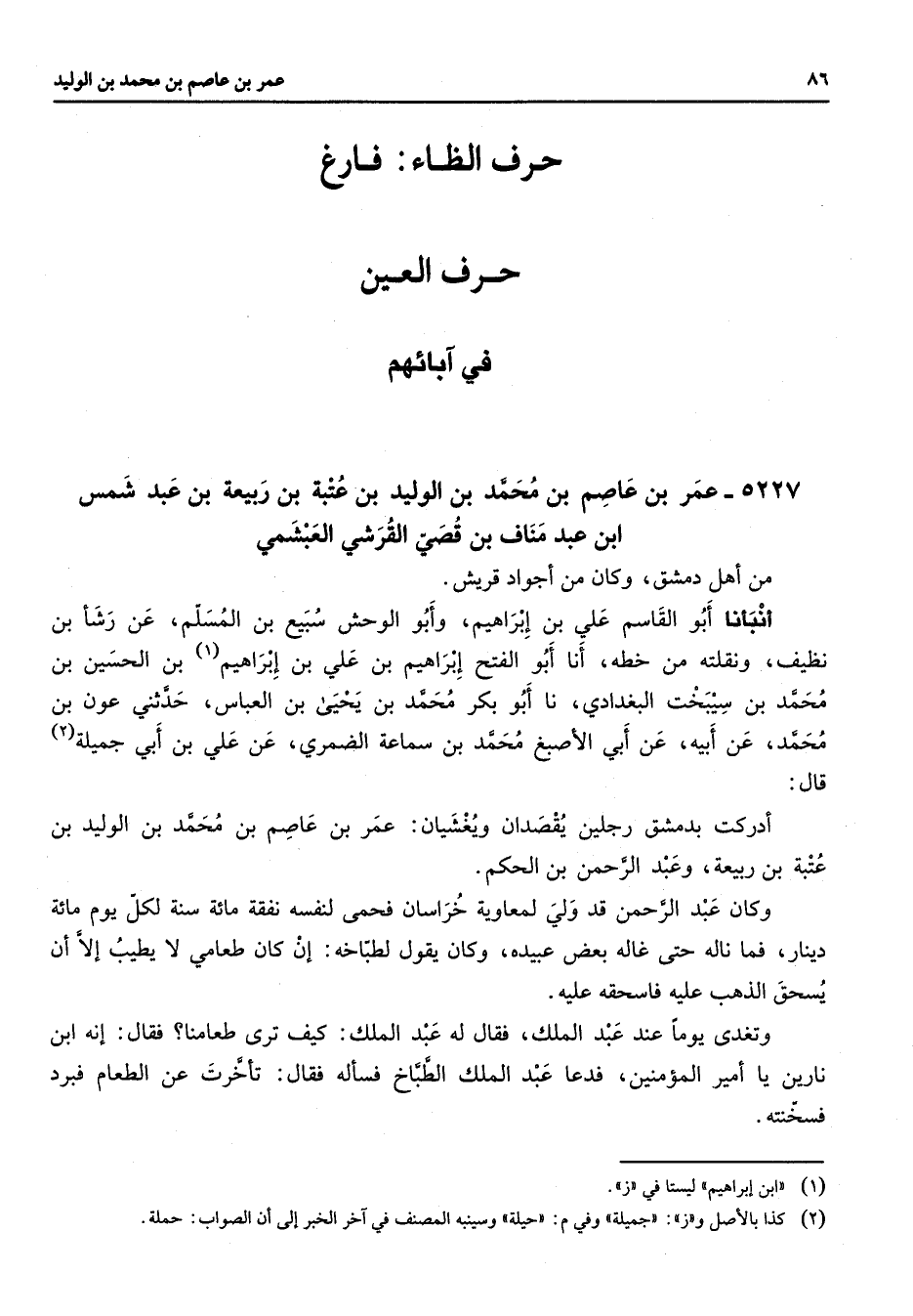 5227 - عمر بن عاصم بن محمد بن الوليد بن عتبة بن ربيعة بن عبد شمس بن عبد مناف بن قصي القرشي العبشمي من أهل دمشق وكان من أجوا قريش أنبأنا أبو القاسم علي بن إبراهيم وأبو الوحش سبيع بن المسلم عن رشأ بن نظيف ونقلته من خطه أنا أبو الفتح إبراهيم بن علي بن إبراهيم (1) بن الحسين بن محمد بن سيبخت البغدادي نا أبو بكر محمد بن يحيى بن العباس حدثني عون بن محمد عن أبيه عن أبي الأصبغ محمد بن سماعة الضمري عن علي بن أبي جميلة قال أدركت بدمشق رجلين يقصدان ويغشيان عمر بن عاصم بن محمد بن الوليد بن عتبة بن ربيعة وعبد الرحمن بن الحكم وكان عبد الرحمن قد ولي لمعاوية خراسان فحمى لنفسه نفقة مائة سنة لكل يوم مائة دينار فما ناله حتى غاله بعض عبيده وكان يقول لطباخه إن كان طعامي لا يطيب إلا أن يسحق الذهب عليه فاسحقه عليه وتغدى يوما عند عبد الملك فقال له عبد الملك كيف ترى طعامنا فقال إنه ابن نارين يا أمير المؤمنين فدعا عبد الملك الطباخ فسأله فقال تأخرت عن الطعام فبرد فسخنته