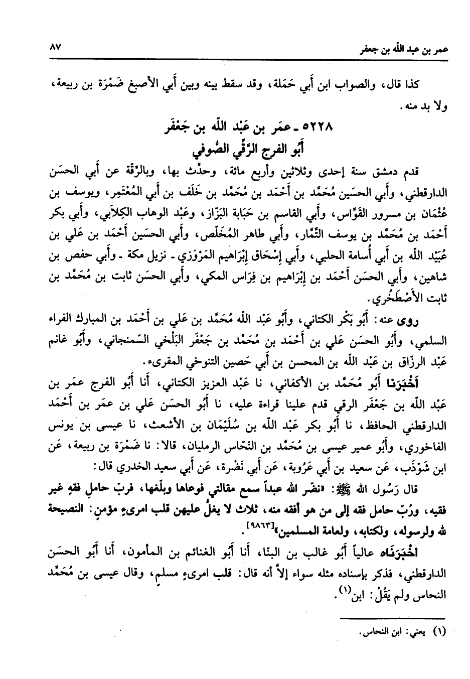 5228 - عمر بن عبد الله بن جعفر أبو الفرج الرقي الصوفي قدم دمشق سنة إحدى وثلاثين وأربع مائة وحدث بها وبالرقة عن أبي الحسن الدارقطني وأبي الحسين محمد بن أحمد بن محمد بن خلف بن أبي المعتمر ويوسف بن عثمان بن مسرور القواس وأبو القاسم بن حبابة البزاز وعبد الوهاب الكلابي وأبي بكر أحمد بن محمد بن يوسف التمار وأبي طاهر المخلص وأبي الحسين أحمد بن علي بن عبيد الله بن أبي أسامة الحلبي وأبي إسحاق إبراهيم المروزي نزيل مكة وأبي حفص بن شاهين وأبي الحسن أحمد بن إبراهيم بن فراس المكي وأبي الحسن ثابت بن محمد بن ثابت الأصطخري روى عنه أبو بكر الكتاني وأبو عبد الله محمد بن علي بن أحمد بن المبارك الفراء السلمي وأبو الحسن علي بن أحمد بن محمد بن جعفر البلخي السمنجاني وأبو غانم عبد الرزاق بن عبد الله بن المحسن بن أبي حصين التنوخي المقرئ أخبرنا أبو محمد بن الأكفاني نا عبد العزيز الكتاني أنا أبو الفرج عمر بن عبد الله بن جعفر الرقي قدم علينا قراءة عليه نا أبو الحسن علي بن عمر بن أحمد الدارقطني الحافظ نا أبو بكر عبد الله بن سليمان بن الأشعث نا عيسى بن يونس الفاخوري وأبو عمير عيسى بن محمد بن النحاس الرمليان قالا نا ضمرة بن ربيعة عن ابن شوذب عن سعيد بن أبي عروبة عن أبي نضرة عن أبي سعيد الخدري قال قال رسول الله (صلى الله عليه وسلم) نضر الله عبدا سمع مقالتي فوعاها وبلغها فرب حامل فقه غير فقيه ورب حامل فقه إلى من هو أفقه منه ثلاث لا يغل عليهن قلب امرئ مؤمن النصيحة لله ولرسوله ولكتابه ولعامة المسلمين أخبرناه عاليا أبو غالب بن البنا أنا أبو الغنائم بن المأمون أنا أبو الحسن الدارقطني فذكر بإسناده مثله سواء إلا أنه قال قلب امرئ مسلم وقال عيسى بن محمد النحاس ولم يقل ابن (1)