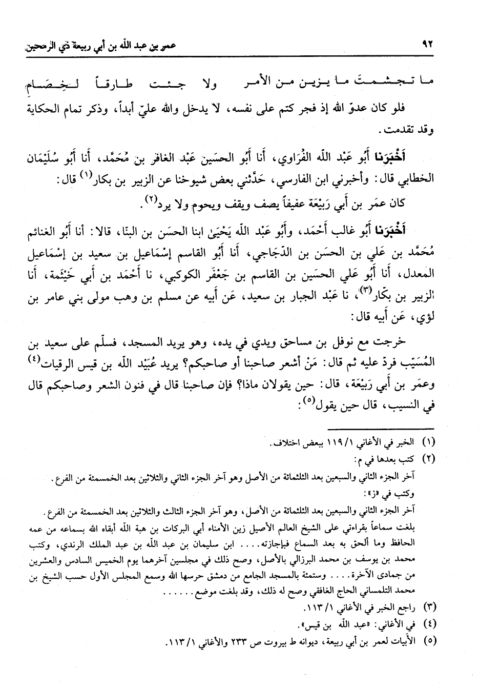 ما تجشمت ما يزين من الأمر * ولا جئت طارقا لخصام * فلو كان عدو الله إذ فجر كتم على نفسه لا يدخل والله علي أبدا وذكر تمام الحكاية وقد تقدمت أخبرنا أبو عبد الله الفراوي أنا أبو الحسين عبد الغافر بن محمد أنا أبو سليمان الخطابي قال وأخبرني ابن الفارسي حدثني بعض شيوخنا عن الزبير بن بكار (1) قال كان عمر بن أبي ربيعة عفيفا يصف ويقف ويحوم ولا يرد (2) أخبرنا أبو غالب أحمد وأبو عبد الله يحيى ابنا الحسن بن البنا قالا أنا أبو الغنائم محمد بن علي بن الحسن بن الدجاجي أنا أبو القاسم إسماعيل بن سعيد بن إسماعيل المعدل أنا أبو علي الحسين بن القاسم بن جعفر الكوكبي نا أحمد بن أبي خيثمة أنا الزبير بن بكار (3) نا عبد الجبار بن سعيد عن أبيه عن مسلم بن وهب مولى بني عامر بن لؤي عن أبيه قال خرجت مع نوفل بن مساحق ويدي في يده وهو يريد المسجد فسلم على سعيد بن المسيب فرد عليه ثم قال من أشعر صاحبنا أو صاحبكم يريد عبيد الله بن قيس الرقيات وعمر بن أبي ربيعة قال حين يقولان ماذا فإن صاحبنا قال في فنون الشعر وصاحبكم قال في النسيب قال حين يقول (5)