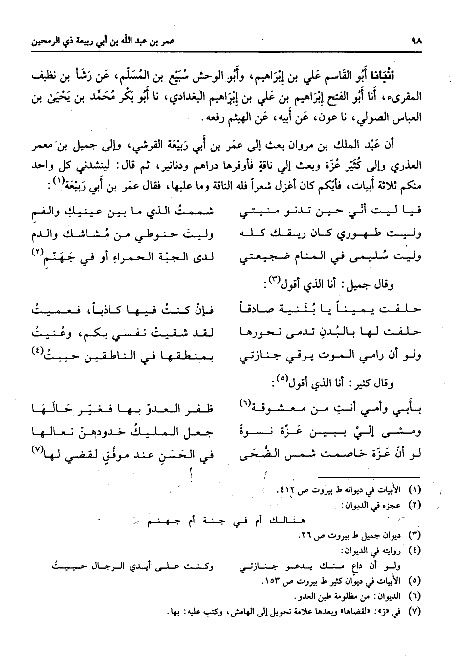 أنبأنا أبو القاسم علي بن إبراهيم وأبو الوحش سبيع بن المسلم عن رشأ بن نظيف المقرئ أنا أبو الفتح إبراهيم بن علي بن إبراهيم البغدادي نا أبو بكر محمد بن يحيى بن العباس الصولي نا عون عن أبيه عن الهيثم رفعه أن عبد الملك بن مروان بعث إلى عمر بن أبي ربيعة القرشي وإلى جميل بن معمر العذري وإلى كثير عزة وبعث إلي ناقة فأوقرها دراهم ودنانير ثم قال لينشدني كل واحد منكم ثلاثة أبيات فأيكم كان أغزل شعرا فله الناقة وما عليها فقال عمر بن أبي ربيعة (1) * فيا ليت أني حين تدنو منيتي * شممت الذي ما بين عينيك والفم وليت طهوري كان ريقك كله * وليت حنوطي من مشاشك والدم وليت سليمى في المنام ضجيعتي * لدى الجبة الحمراء أو في جنهم * وقال جميل أنا الذي أقول (3) * حلفت يمينا يا بثينة صادقا * فإن كنت فيها كاذبا فعميت * * حلفت لها بالبدن تدمى نحورها * لقد شقيت نفسي بكم وعنيت ولو أن رامي الموت يرقي جنازتي * بمنطقها في الناطقين حييت * وقال كثير أنا الذي أقول (5) * بأبي وأمي أنت من معشوقة (6) * ظفر العدو بها فغير حالها ومشى إلي ببين عزة نسوة * جعل المليك خدودهن نعالها لو أن عزة خاصمت شمس الضحى * في الحسن عند موفق لقضي لها (7) *