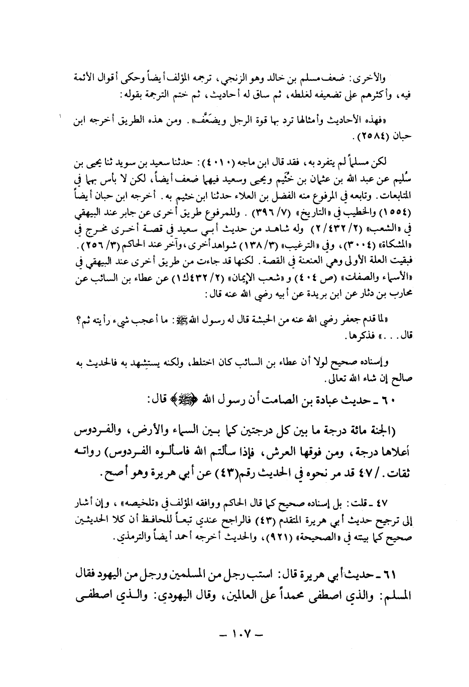 "الْجَنَّةُ مِائَةُ دَرَجَةٍ مَا بَيْنَ كُلِّ دَرَجَتَيْنِ كَمَا بَيْنَ السَّمَاءِ وَالأَرْضِ, وَالْفِرْدَوْسُ أَعْلاهَا دَرَجَةً وَمِنْ فَوْقِهَا الْعَرْشُ فَإِذَا سَأَلْتُمُ الله فاسألوه الفردوس" رواته ثقات. قد مر نحوه في الحديث رقم "43" عَنْ أَبِي هُرَيْرَةَ وَهُوَ أَصَحُّ.