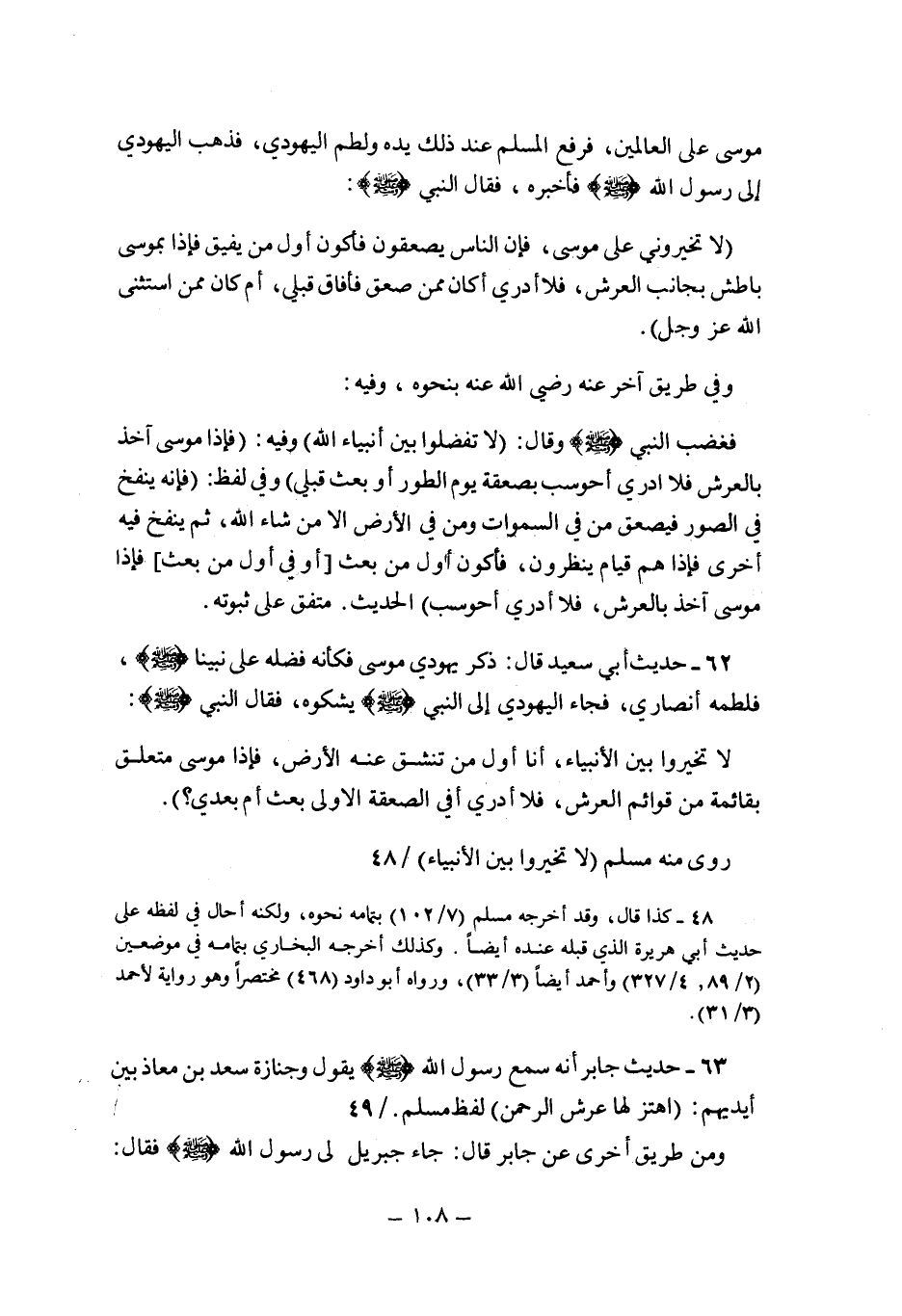 62- حَدِيثُ أبي سعيد قال: ذكري يَهُودِيٌّ مُوسَى فَكَأَنَّهُ فَضَّلَهُ عَلَى نَبِيِّنَا صَلَّى اللَّهُ عَلَيْهِ وَسَلَّمَ، فلطمه أنصاري، فجء الْيَهُودِيُّ إِلَى النَّبِيِّ صَلَّى اللَّهُ عَلَيْهِ وَسَلَّمَ يَشْكُوهُ، فَقَالَ النَّبِيُّ صَلَّى اللَّهُ عَلَيْهِ وَسَلَّمَ: