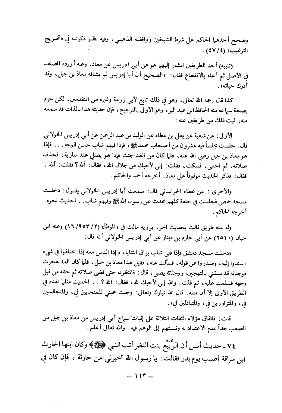 الأولى: عن شعبة عَنْ يَعْلَى بْنِ عَطَاءٍ عَنْ الوليد بن عبد الرحمن عن أبي إدريس الخولاني قال: جلست مجلسا فيه عشرون من أصحاب مُحَمَّدٍ صَلَّى اللَّهُ عَلَيْهِ وَسَلَّمَ، فإذا فيهم شاب حسن الوجه ... فإذا هو معاذ بن جبل رضي الله عنه، فلما كان الغد جئت فإذا هو يصلي عند سارية، فحذفش صلاته، ثم احتبى، فسكت، فقلت: إني لأحبك من جلال الله، فقال: آلله؟ فقلت: آالله. فقال: فذكر الحديث موقوفا على معاذ. أخرجه أحمد والحاكم.
