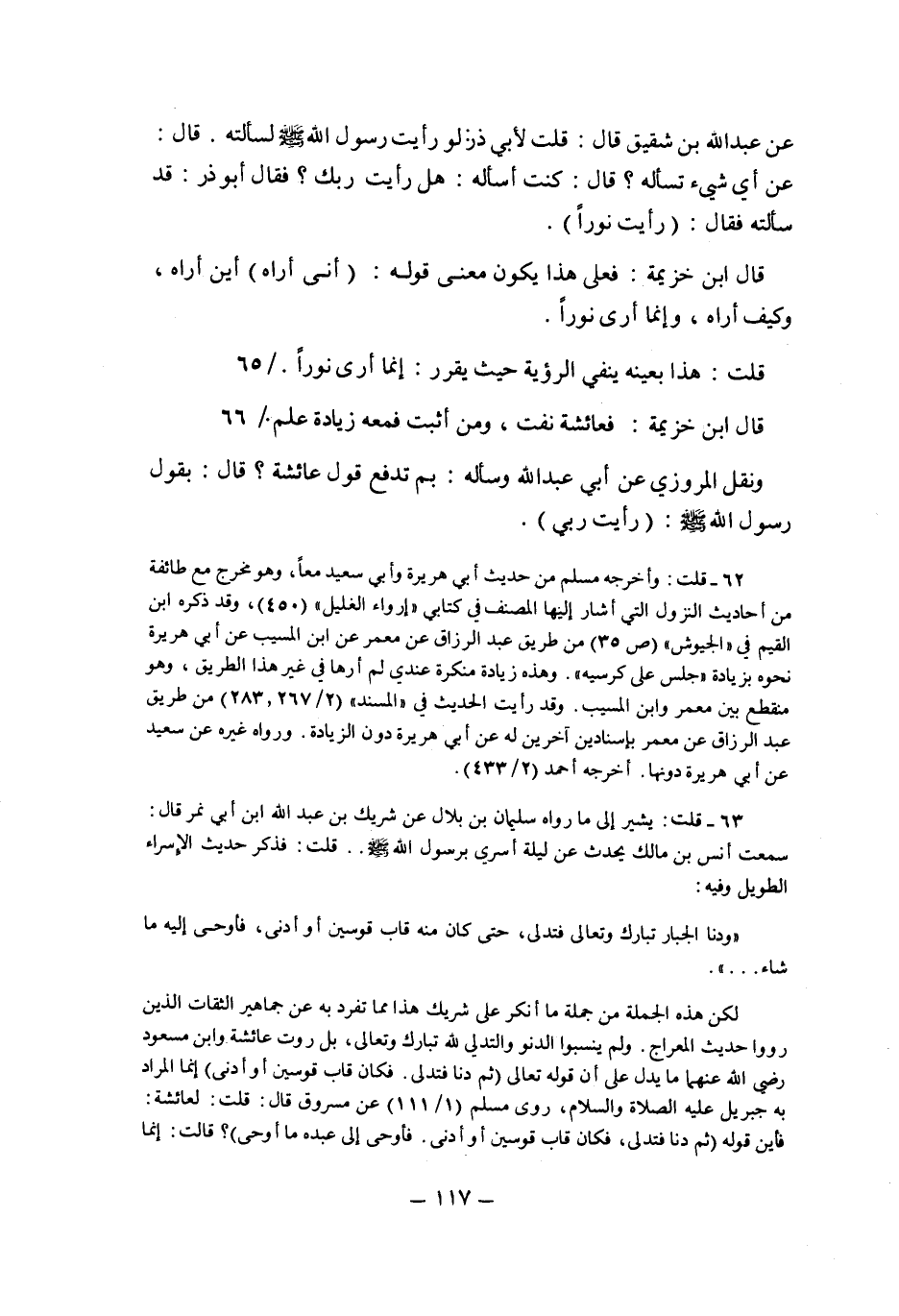 عَنْ عَبْدِ اللَّهِ بْنِ شَقِيقٍ قَالَ: قُلْتُ لأَبِي ذَرٍّ: لَوْ رَأَيْتُ رَسُولَ اللَّهِ صَلَّى اللَّهُ عَلَيْهِ وَسَلَّمَ لَسَأَلْتُهُ. قَالَ: عَنْ أَيِّ شَيْءٍ تَسْأَلُهُ؟ قَالَ: كُنْتُ أسأله: هل رأيت ربك؟ فقال أَبُو ذَرٍّ: قَدْ سَأَلْتُهُ فَقَالَ: "رَأَيْتُ نُورًا".