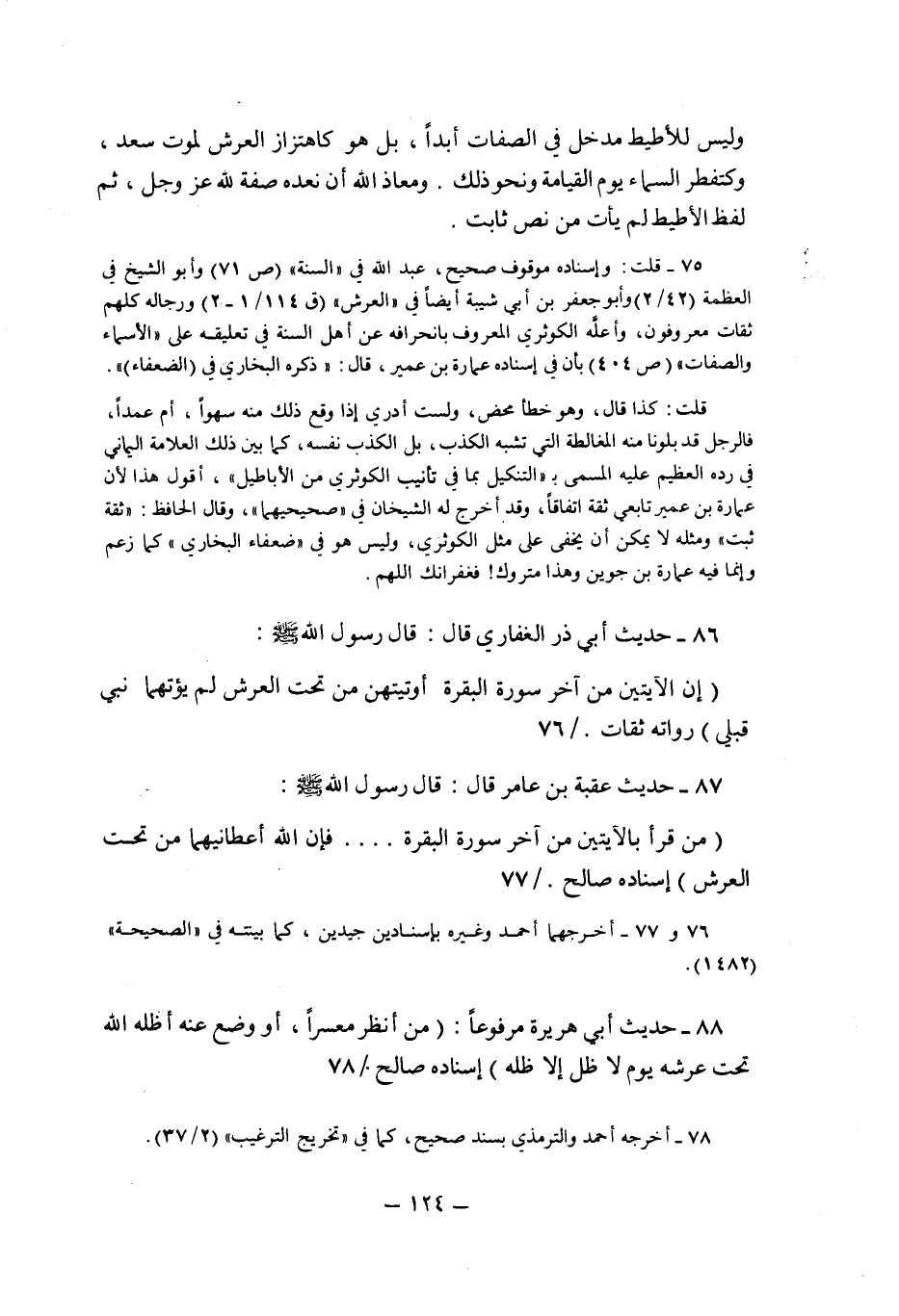 75- قلت: وإسناده موقوف صحيح، عبد الله في "السنة" "ص71" وأبو الشيخ في العظمة "42/ 2" وأبو جعفر بن أبي شيبة أيضا في "العرش" "ق114/ 1-2" ورجاله كلهم ثقات معروفون، وأعله الكوثري المعروف بانحرافه عن أهل السنة في تعليقه على "الأسماء والصفات" "ص404" بأن في إسناده عمارة بن عمير، قال: "ذكره البخاري في "الضعفاء"".