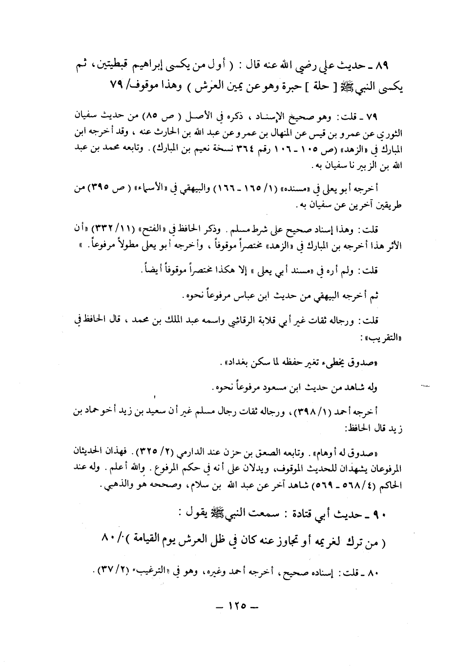 89- حديث عَلِيٍّ رَضِيَ اللَّهُ عَنْهُ قَالَ: "أول من يكسى إبراهيم قبطيتين، ثم يكسى النبي صلى الله عليه وسلم "حلة" حبرة وهو عن يمين العرش" وهذا موقوف