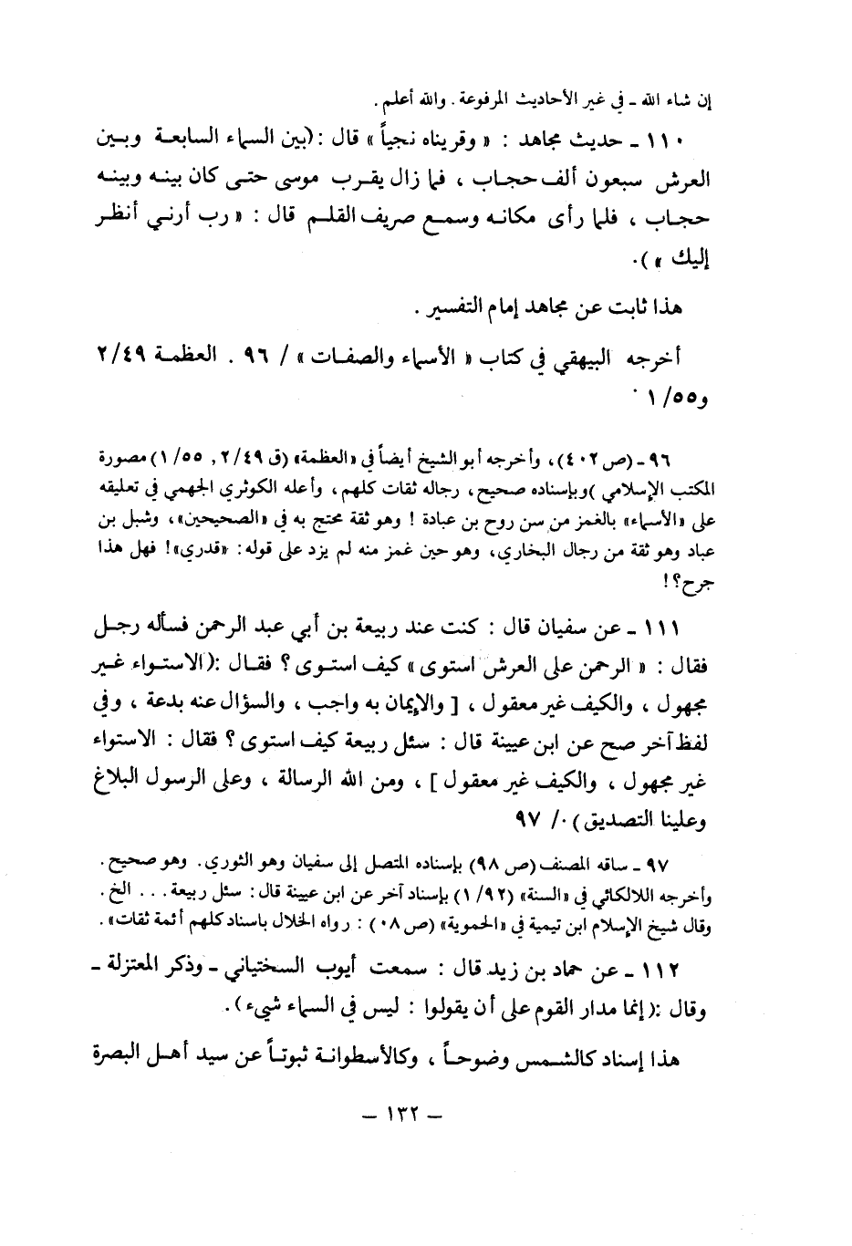 111- عن سفيان قال: كنت عند ربيعة بن أبي عبد الرحمن فسأله رجل فقال {الرَّحْمَنُ عَلَى الْعَرْشِ اسْتَوَى} كيف استوى؟ فقال: الاستواء غير مجهول والكيف غير معقول "والإيمان به واجب والسؤال عنه بدعة, وفي لفظ آخر صح عن ابن عيينة قال: سئل ربيعة كيف استوى؟ فقال: الاستواء غير مجهول والكيف غير معقول" ومن الله الرسالة وعلى الرسول البلاغ وعلينا التصديق ".