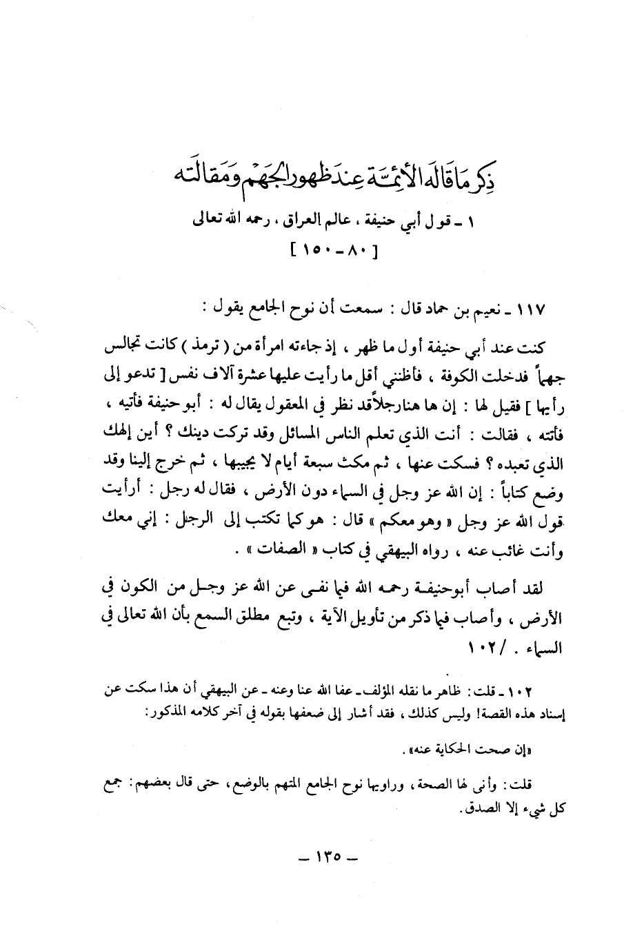كنت عند أبي حنيفة أول ما ظهر، إذ جاءته امرأة من "ترمذ" كانت تجالس جهماً فدخلت الكوفة، فأظنني أقل ما رأيت عليها عشرة آلاف نفس "تدعو إلى رأيها" فقيل لها: إن ها هنا رجلاً قد نظر في المعقول يقال له: أبو حنيفة فأتيه، فأتته، فقالت: أنت الذي تعلم الناس المسائل وقد تركت دينك؟ أين إلهك الذي تعبده؟ فسكت عنها، ثم مكث سبعة أيام لا يجيبها، ثم خرج إلينا وقد وضع كتاباً: إن الله عز وجل في السماء دون الأرض، فقال له رجل: أرأيت قول الله عز وجل: "وهو معكم" قال: هو كما تكتب إلى الرجل: إني معك وأنت غائب عنه، رواه البيهقي في كتاب "الصفات".