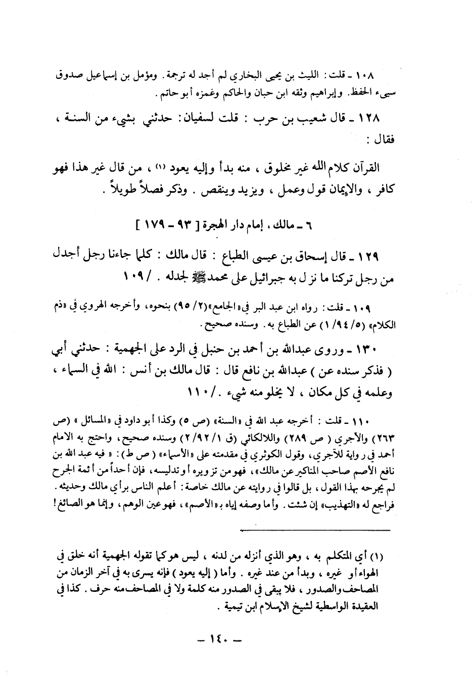 109- قلت: رواه ابن عبد البر في "الجامع" "2/ 95" بنحوه، وأخرجه الهروي في "ذم الكلام" 5/ 94/ 1" عن الطباع به. وسنده صحيح.