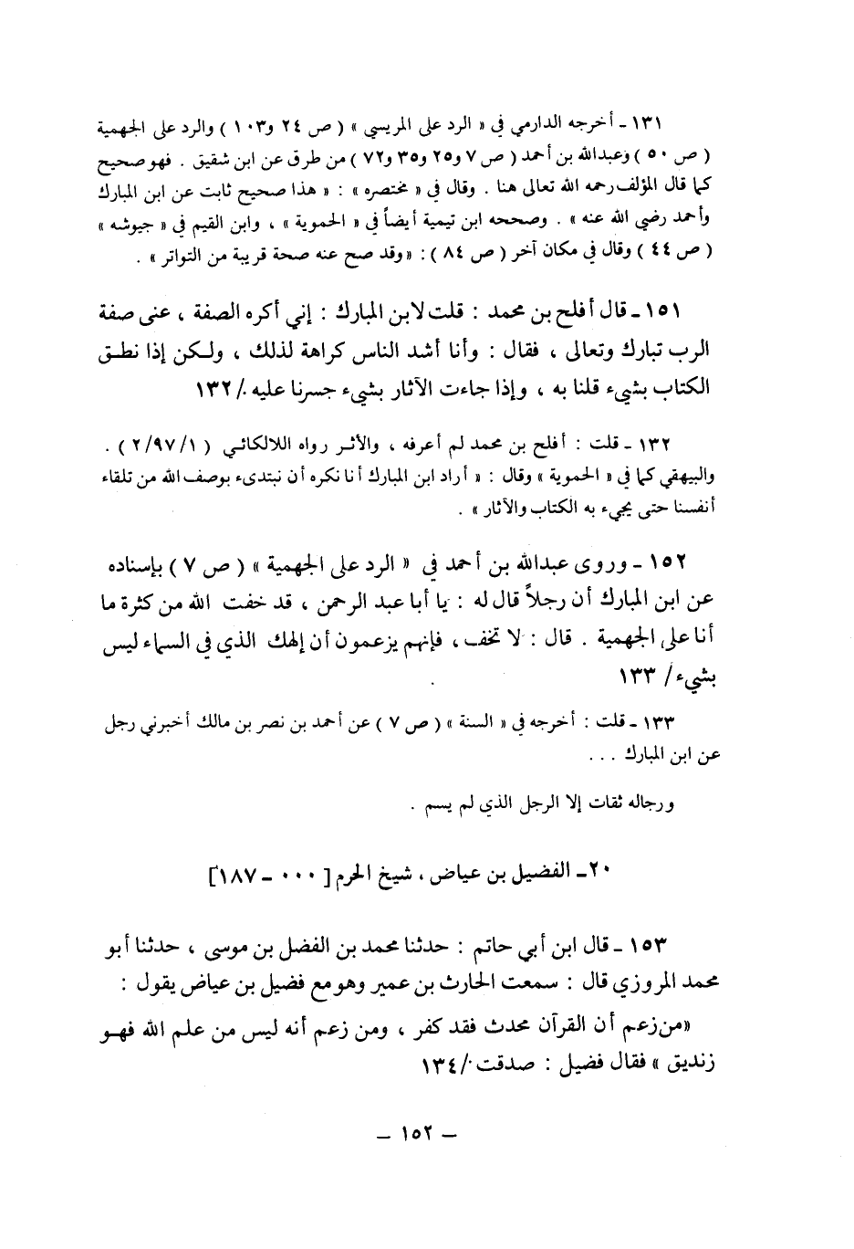 151- قال أفلح بن محمد: قلت لابن المبارك: إني أكره الصفة، عنى صفة الرب تبارك وتعالى، فقال: وأنا أشد الناس كراهة لذلك، ولكن إذا نطق الكتاب بشيء قلنا به، وإذا جاءت الآثار بشيء جسرنا عليه.