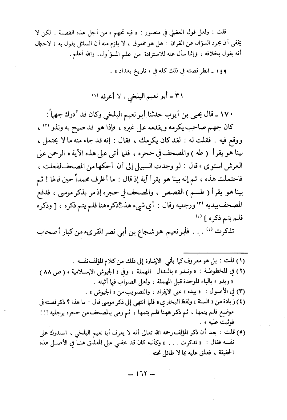 5 قلت: بعد أن ذكر المؤلف رحمه الله تعالى أنه لا يعرف أبا نعيم البلخي، استدرك على نفسه فقال: "تذكرت ... " وكأنه كان قد خفي على المعلق هنا في الأصل هذه الحقيقة، فعلق عليه بما لا طائل تحته.