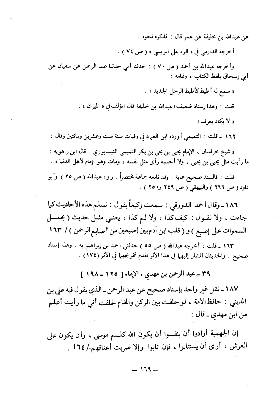 187- نقل غير واحد بإسناد صحيح عن عبد الرحمن -الذي يقول فيه علي بن المديني: حافظ الأمة، لو حلفت بين الركن والمقام لحلفت أني ما رأيت أعلم من ابن مهدي- قال: