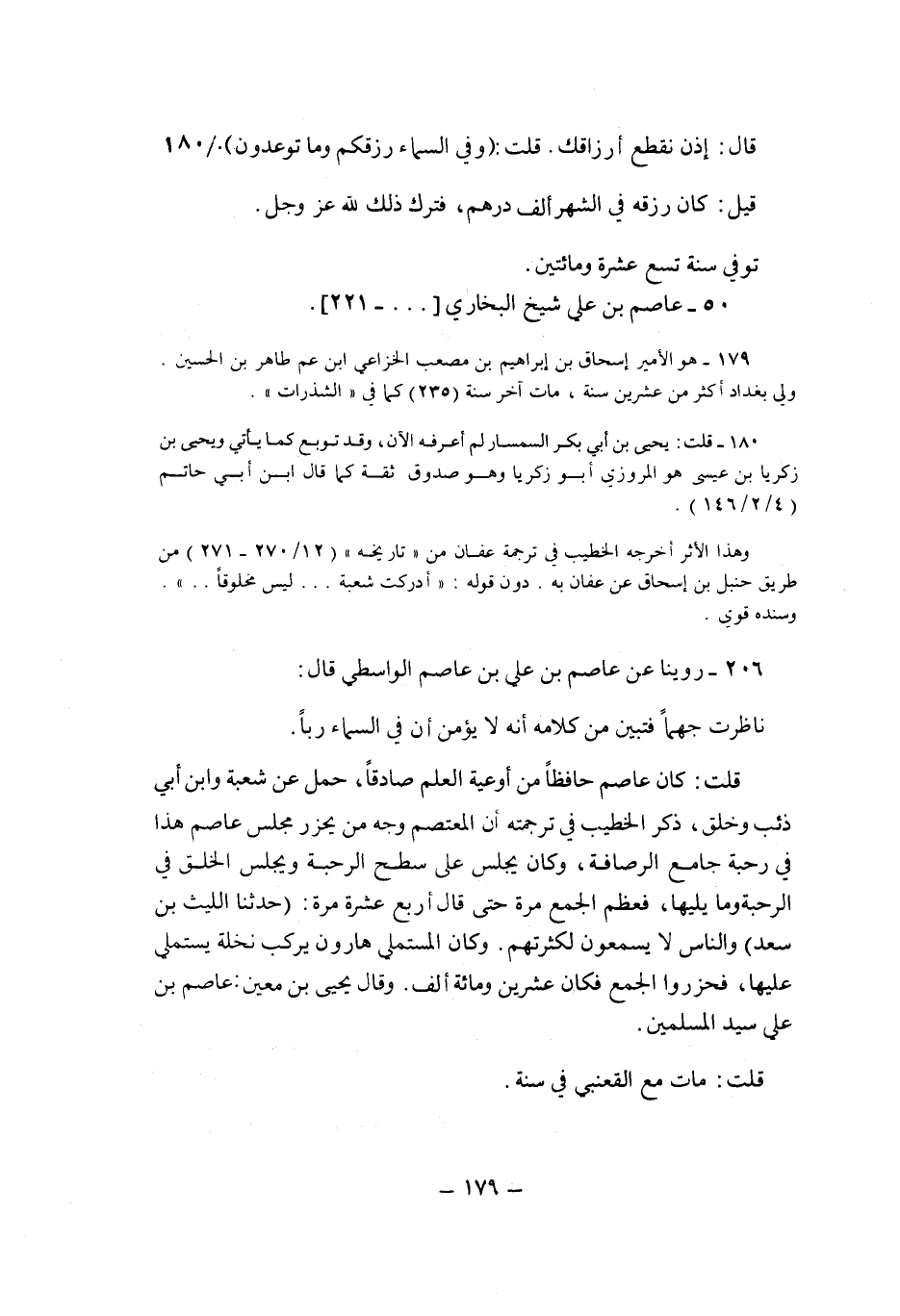 179- هو الأمير إسحاق بن إبراهيم بن مصعب الخزاعي ابن عم طاهر بن الحسين. ولي بغداد أكثر من عشرين سنة، مات آخر سنة "235" كما في "الشذرات".