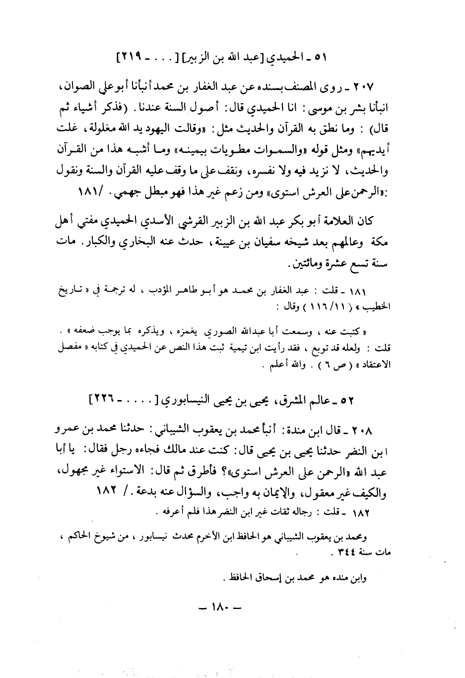 207- روى المصنف بسنده عن عبد الغفار بن محمد أنبأنا أبو علي الصوان، أنبأنا بشر بن موسى: أنا الحميدي قال: أصول السنة عندنا. "فذكر أشياء ثم قال": وما نطق به القرآن والحديث مثل: {وَقَالَتِ الْيَهُودُ يَدُ اللَّهِ مَغْلُولَةٌ غُلَّتْ أَيْدِيهِمْ} ومثل قوله" {وَالسَّمَاوَاتُ مَطْوِيَّاتٌ بِيَمِينِهِ} وما أشبه هذا من القرآن والحديث، لا نزيد فيه ولا نفسره، ونقف على ما وقف عليه القرآن والسنة ونقول: {الرَّحْمَنُ عَلَى الْعَرْشِ اسْتَوَى} ومن زعم هذا فهو مبطل جهمي.