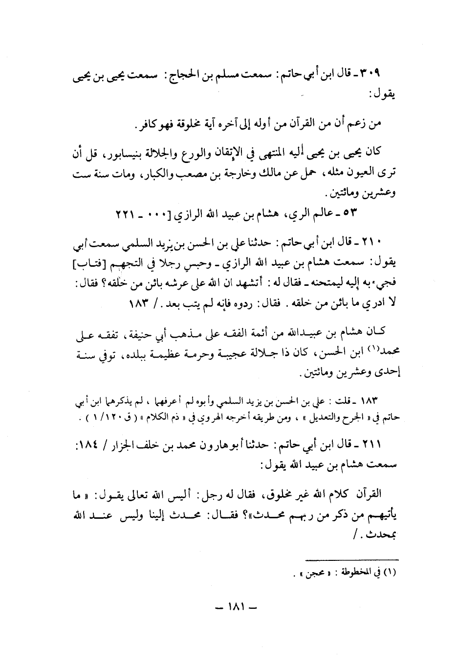 309- قال ابن أبي حاتم: سمعتم مسلم بن الحجاج: سمعت يحيى بن يحيى يقول: