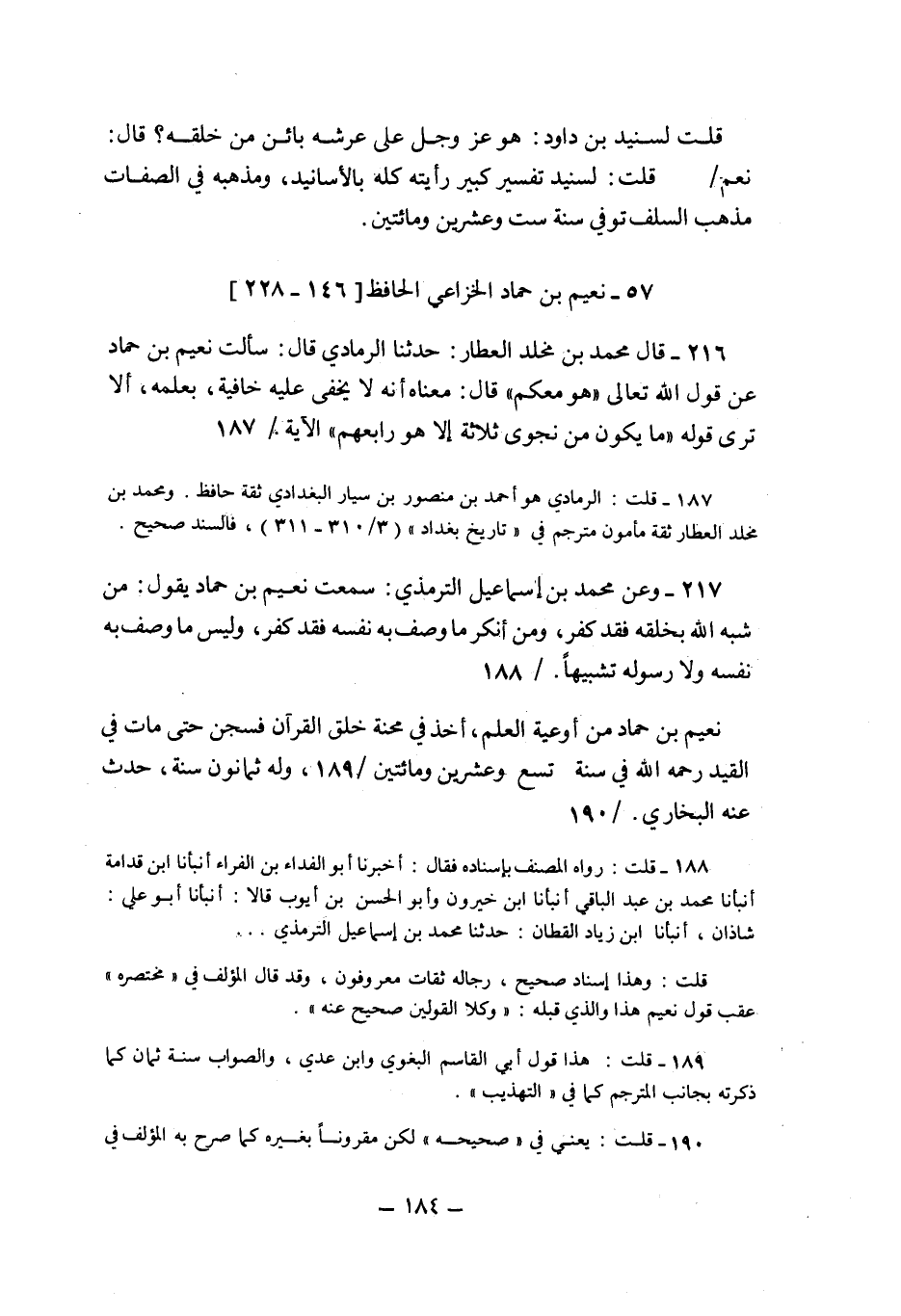 217- وعن محمد بن إسماعيل الترمذي: سمعت نعيم بن حماد يقول: من شبه الله بخلقه فقد كفر، ومن أنكر ما وصف به نفسه فقد كفر، وليس ما وصف به نفسه ولا رسوله تشبيهاً.