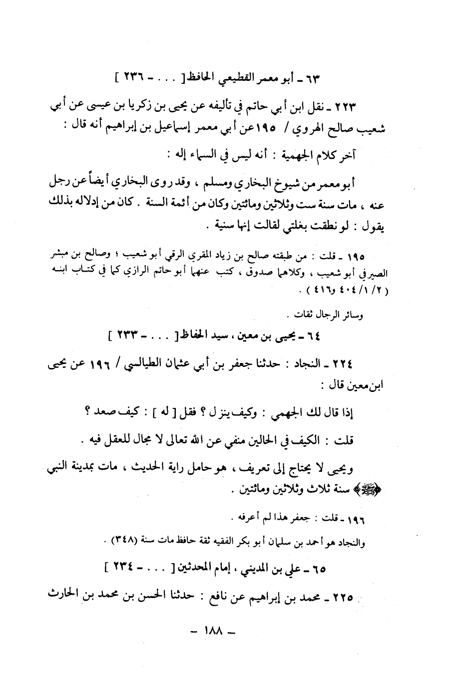 223- نقل ابن أبي حاتم في تأليفه عن يحيى بن زكريا بن عيسى عن أبي شعيب صالح الهروي عن أبي معمر إسماعيل بن إبراهيم أنه قال:
