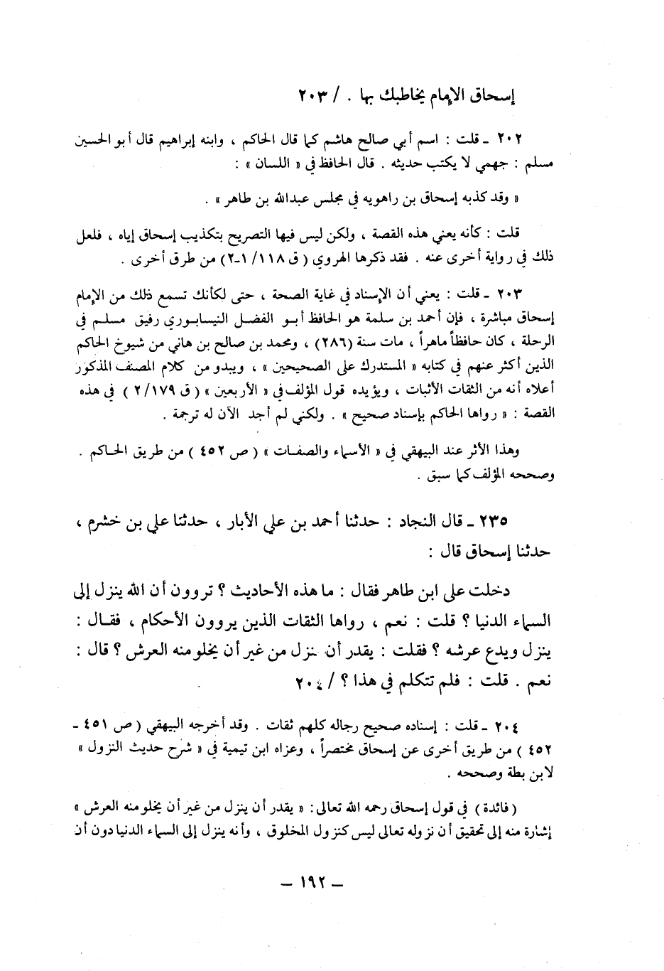 204- قلت: إسناده صحيح رجاله كلهم ثقات. وقد أخرجه البيهقي "ص451-452" من طريق أخرى عن إسحاق مختصرا، وعزاه ابن تيمية في "شرح حديث النزول" لابن بطة وصححه.