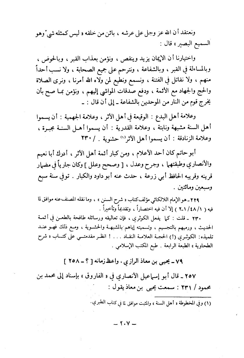 229- هو الإمام اللالكائي مؤلف كتاب "شرح السنن"، وما نقله المصنف عنه موافق لما فيه "1/ 48/ 1-2" إلا أن فيه اختصارا، وتقديما وتأخيرا.