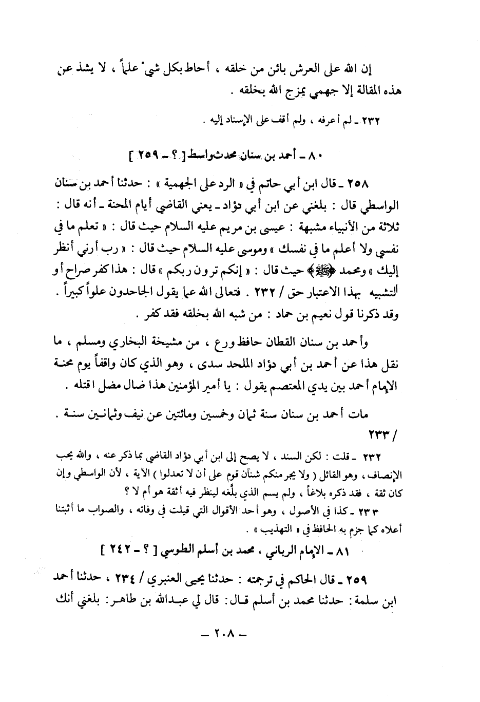 232- قلت: لكن السند، لا يصح إلى ابن أبي دؤاد القاضي بما ذكر عنه، والله يحب الإنصاف، وهو القائل {وَلا يَجْرِمَنَّكُمْ شَنَآنُ قَوْمٍ عَلَى أَلَّا تَعْدِلُوا} الآية، لأن الواسطي وإن كان ثقة، فقد ذكره بلاغا، ولم يسم الذي بلغه لينظر فيه أثقة هو أم لا؟