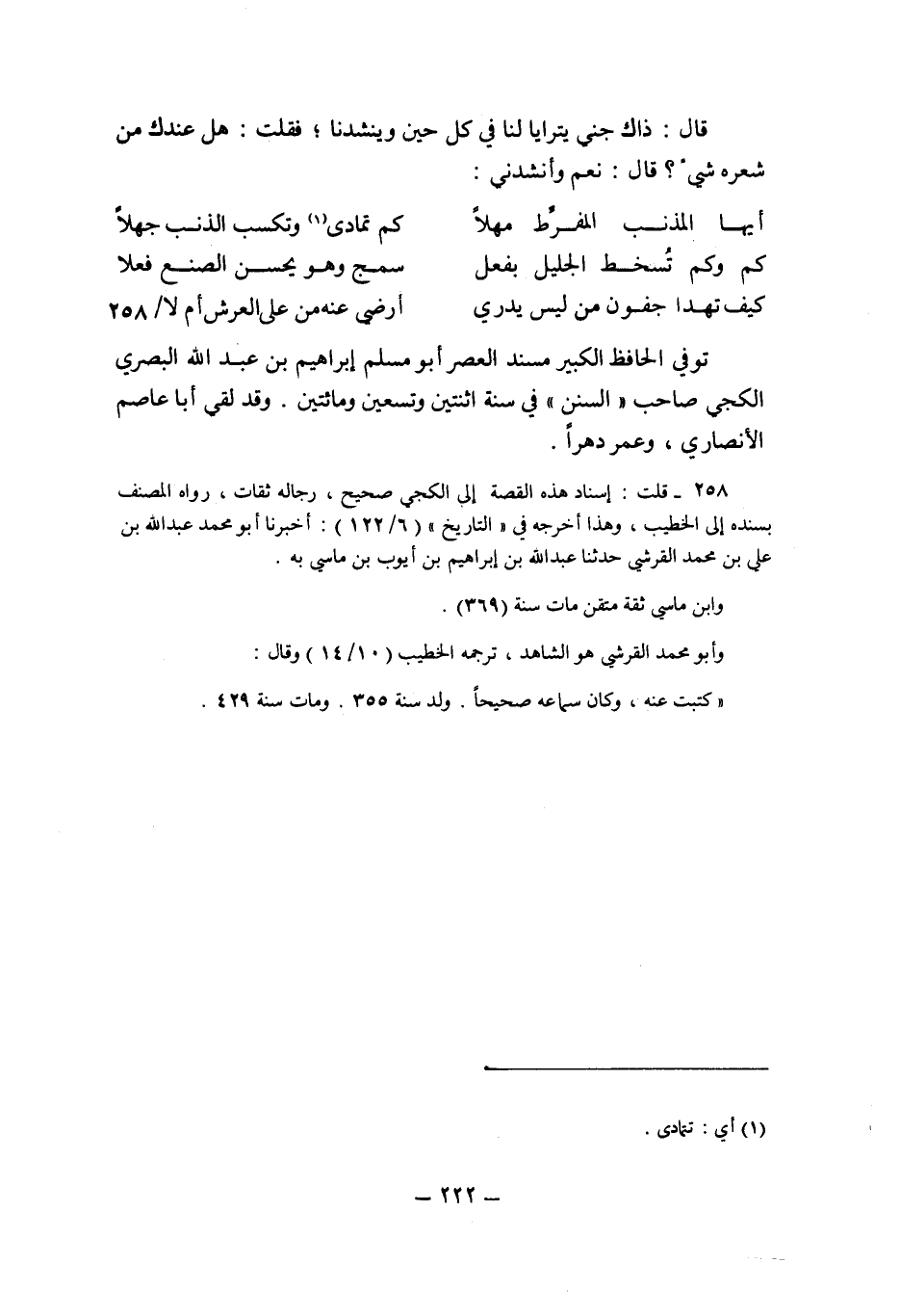 258- قلت: إسناد هذه القصة إلى الكجي صحيح، رجاله ثقات، رواه المصنف بسنده إلى الخطيب، وهذا أخرجه في "التاريخ" "6/ 122": أخبرنا أبو محمد عبد الله بن علي بن محمد القرشي حدثنا عبد الله بن إبراهيم بن أيوب بن ماسي به.