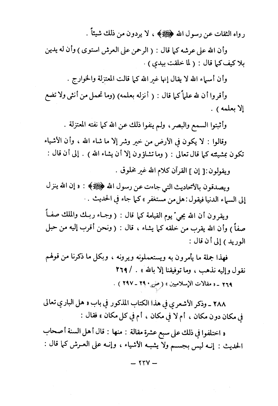 288- وذكر الأشعري في هذا الكتاب المذكور في باب "هل الباري تعالى في مكان دون مكان، أم لا في مكان، أم في مكان فقال: