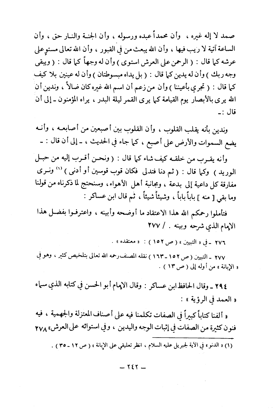 294- وقال الحافظ ابن عساكر: وقال الإمام أبو الحسن في كتابه الذي سماه "العمد في الرؤية":