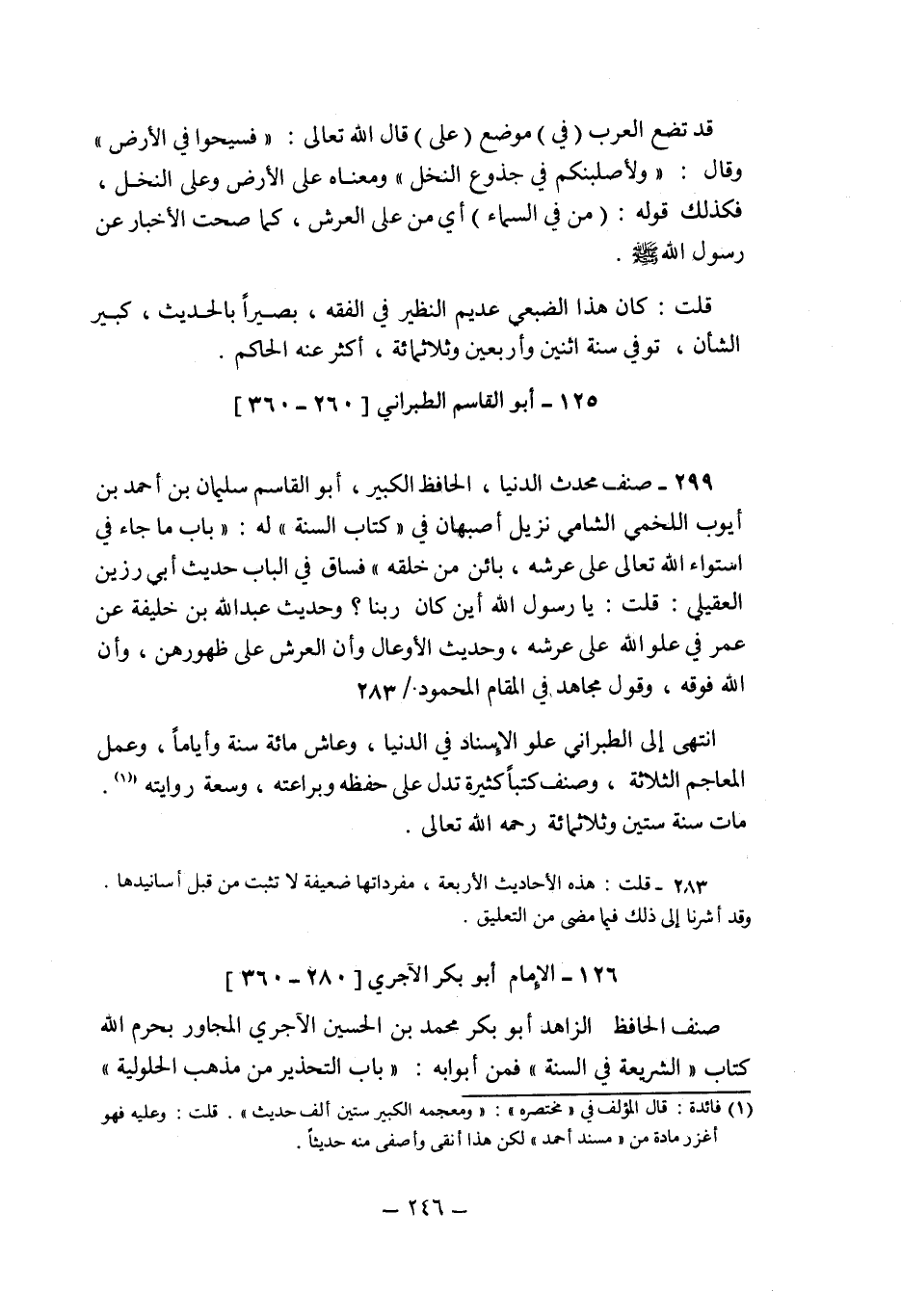 299- صنف محدث الدنيا، الحافظ الكبير، أبو القاسم سليمان بن أحمد بن أيوب اللخمي الشامي نزيل أصبهان في "كتاب السنة" له: "باب ما جاء في استواء الله تعالى على عرشه، بائن من خلقه" فساق في الباب حديث أبي رزين العقيلي: قلت: يا رسول الله أين كان ربنا؟ وحديث عبد الله بن خليفة عن عمر في علو الله على عرشه، وحديث الأوعال وأن العرش على ظهورهن، وأن الله فوقه، وقول مجاهد في المقام المحمود.