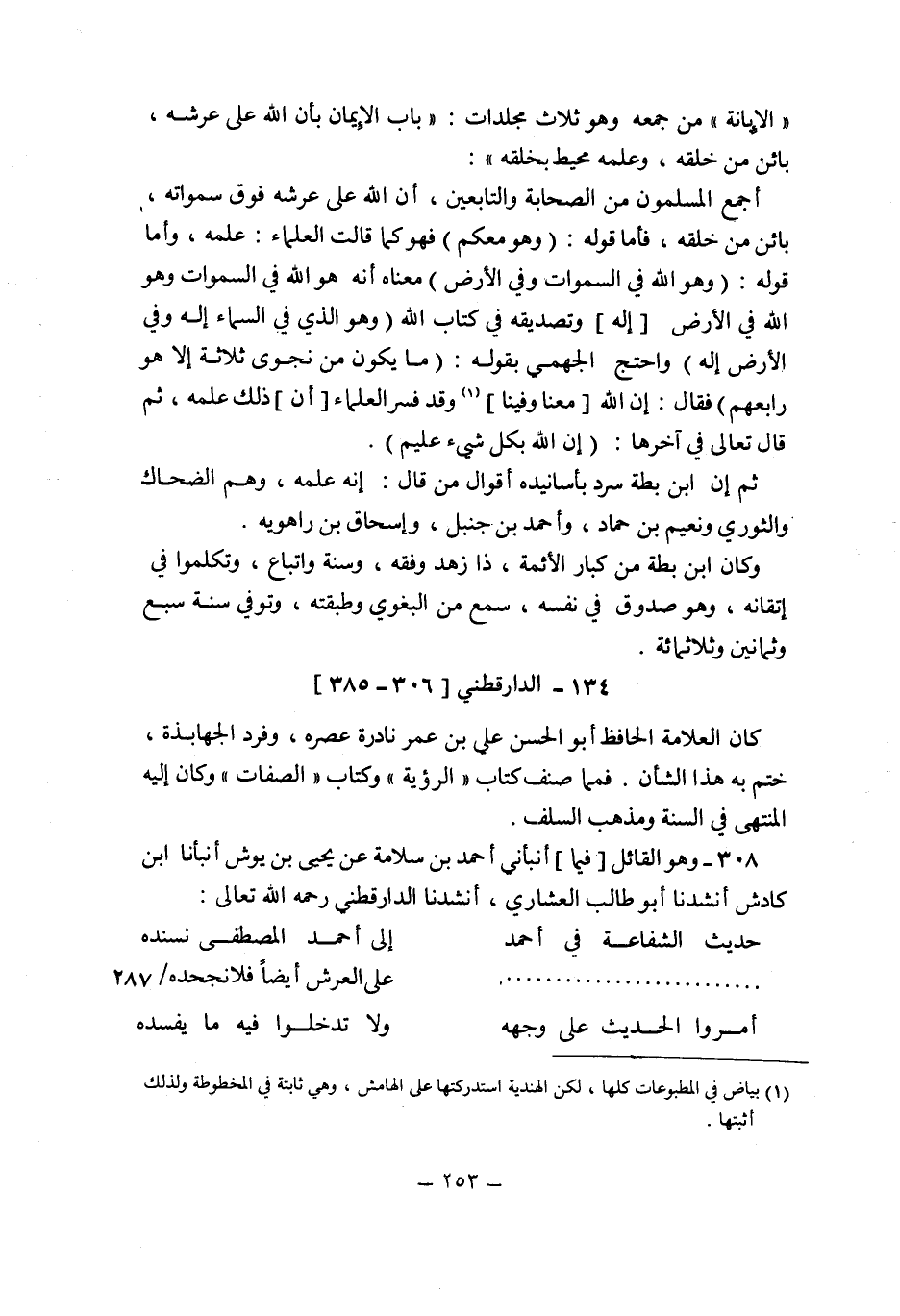 كان العلامة الحافظ أبو الحسن علي بن عمر نادرة عصره، وفرد الجهابذة، ختم به هذا الشأن، فمما صنف كتاب "الرؤية" وكتاب "الصفات" وكان إليه المنتهى في السنة ومذهب السلف.