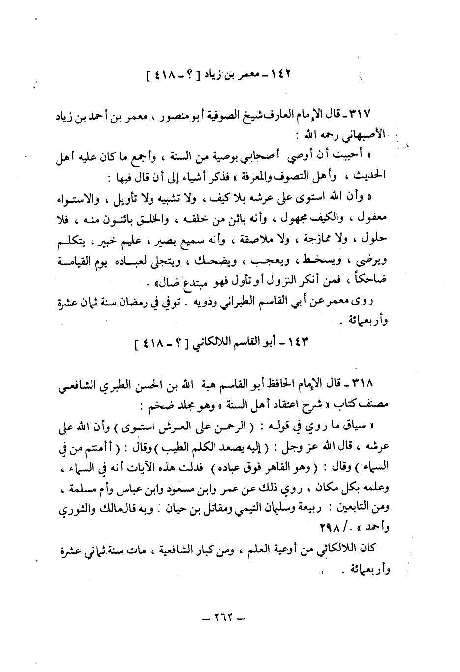 318- قال الإمام الحافظ أبو القاسم هبة الله بن الحسن الطبري الشافعي مصنف كتاب "شرح اعتقاد أهل السنة" وهو مجلد ضخم: