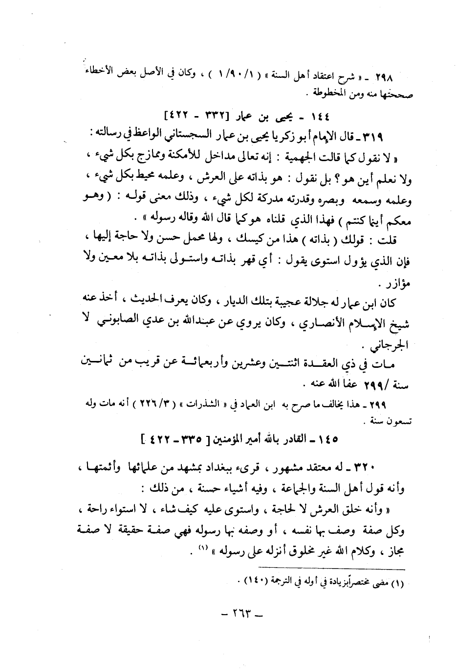 319- قال الإمام أبو زكريا يحيى بن عمار السجستاني الواعظ في رسالته: "لا نقول كما قالت الجهمية: إنه تعالى مداخل للأمكنة وممازج بكل شيء، ولا نعلم أين هو؟ بل نقول: هو بذاته على العرش، وعلمه محيط بكل شيء، وعلمه وسمعه، وبصره وقدرته مدركة لكل شيء، وذلك معنى قوله: {وَهُوَ مَعَكُمْ أَيْنَ مَا كُنْتُمْ} فهذا الذي قلناه هو كما قال الله وقاله رسوله".
