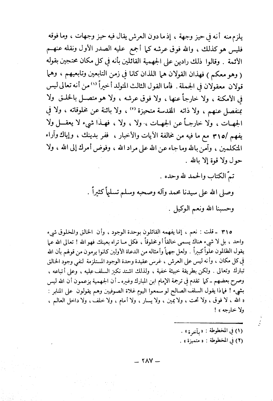 315- قلت: نعم، إنما يفهمه القائلون بوحدة الوجود، وأن الخالق والمخلوق شيء واحد، بل لا شيء هناك يسمى خالقا أو مخلوقا، فكل ما تراه بعينك فهو الله! تعالى الله عما يقول الظالمون علوا كبيرا، ولعل جهما وأمثاله من الدعاة الأولين كانوا يرمون من قولهم بأن الله في كل مكان، وأنه ليس على العرش، غرس عقيدة وحدة الوجود المستلزمة لنفي وجود الخالق تبارك وتعالى. ولكن بطريقة خبيثة خفية، ولذلك اشتد نكير السلف عليه، وعلى أتباعه، وصرح بعضهم -كما تقدم في ترجمة الإمام ابن المبارك وغيره- أن الجهمية يزعمون أن الله ليس بشيء! فماذا يقول السلف الصالح لو سمعوا اليوم غلاة الصوفيين وهم يقولون على المنابر: "الله، لا فوق، ولا تحت، ولا يمين، ولا يسار، ولا أمام، ولا خلف، ولا داخل العالم، ولا خارجه"!