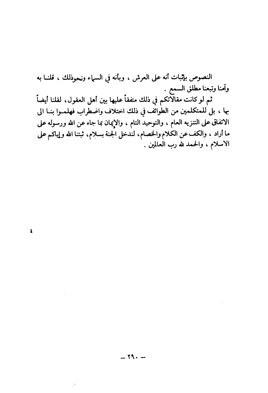 ثم لو كانت مقالاتكم في ذلك متفقا عليها بين أهل العقول، لقلنا أيضا بها، بل للمتكلمين من الطوائف في ذلك اختلاف واضطراب فهلموا بنا إلى الاتفاق على التنزيه العام، والتوحيد التام، والإيمان بما جاء عن الله ورسوله على ما أراد، والكف عن الكلام والخصام، لندخل الجنة بسلام، ثبتنا الله وإياكم على الإسلام، والحمد لله رب العالمين.