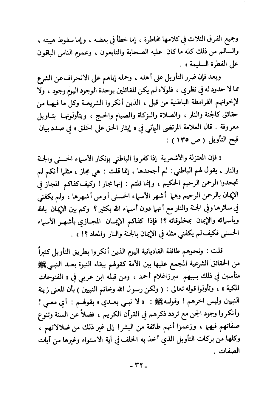 قلت: ونحوهم طائفة القاديانية اليوم الذين أنكروا بطريق التأويل كثيرا من الحقائق الشرعية المجمع عليها بين الأمة كقولهم ببقاء النبوة بعد النبي صلى الله عليه وسلم متأسين في ذلك بنبيهم ميرزاغلام أحمد, ومن قبله ابن عربي في "الفتوحات المكية" وتأولوا قوله تعالى: {وَلَكِنْ رَسُولَ اللَّهِ وَخَاتَمَ النَّبِيِّينَ} بأن المعنى زينة النبيين وليس آخرهم! وقوله صَلَّى اللَّهُ عَلَيْهِ وَسَلَّمَ: "لا نبي بعدي" بقولهم: أي معي! وأنكروا وجود الجن مع تردد ذكرهم في القرآن الكريم, فضلا عن السنة وتنوع صفاتهم فيهما, وزعموا أنهم طائفة من البشر! إلى غير ذلك من ضلالاتهم, وكلها من بركات التأويل الذي أخذ به الخلف في آية الاستواء وغيرها من آيات الصفات.