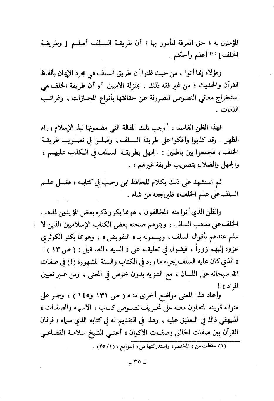 فهذا الظن الفاسد, أوجب تلك المقالة التي مضمونها نبذ الإسلام وراء الظهر. وقد كذبوا وأفكوا على طريقة السلف, وضلوا في تصويب طريقة الخلف فجمعوا بين باطلين: الجهل بطريقة السلف في الكذب عليهم, والجهل والضلال بتصويب طريقة غيرهم".