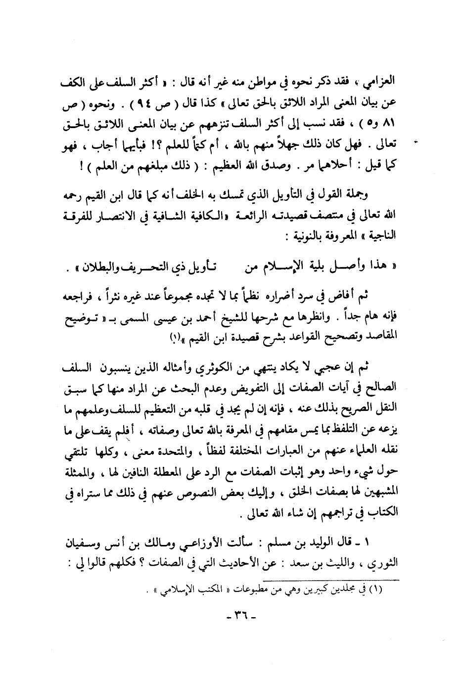 العزامي, فقد ذكر نحوه في مواطن منه غير أنه قال: "أكثر السلف على الكف عن بيان المعنى المراد اللائق بالحق تعالى" كذا قال "ص94 ". ونحوه "ص81 و5", فقد نسب إلى أكثر السلف تنزههم عن بيان المعنى اللائق بالحق تعالى. فهل كان ذلك جهلا منهم بالله, أم كتما للعلم؟! فبأيهما أجاب, فهو كما قيل: أحلاهما مر. وصدق الله العظيم: {ذَلِكَ مَبْلَغُهُمْ مِنَ الْعِلْم} !