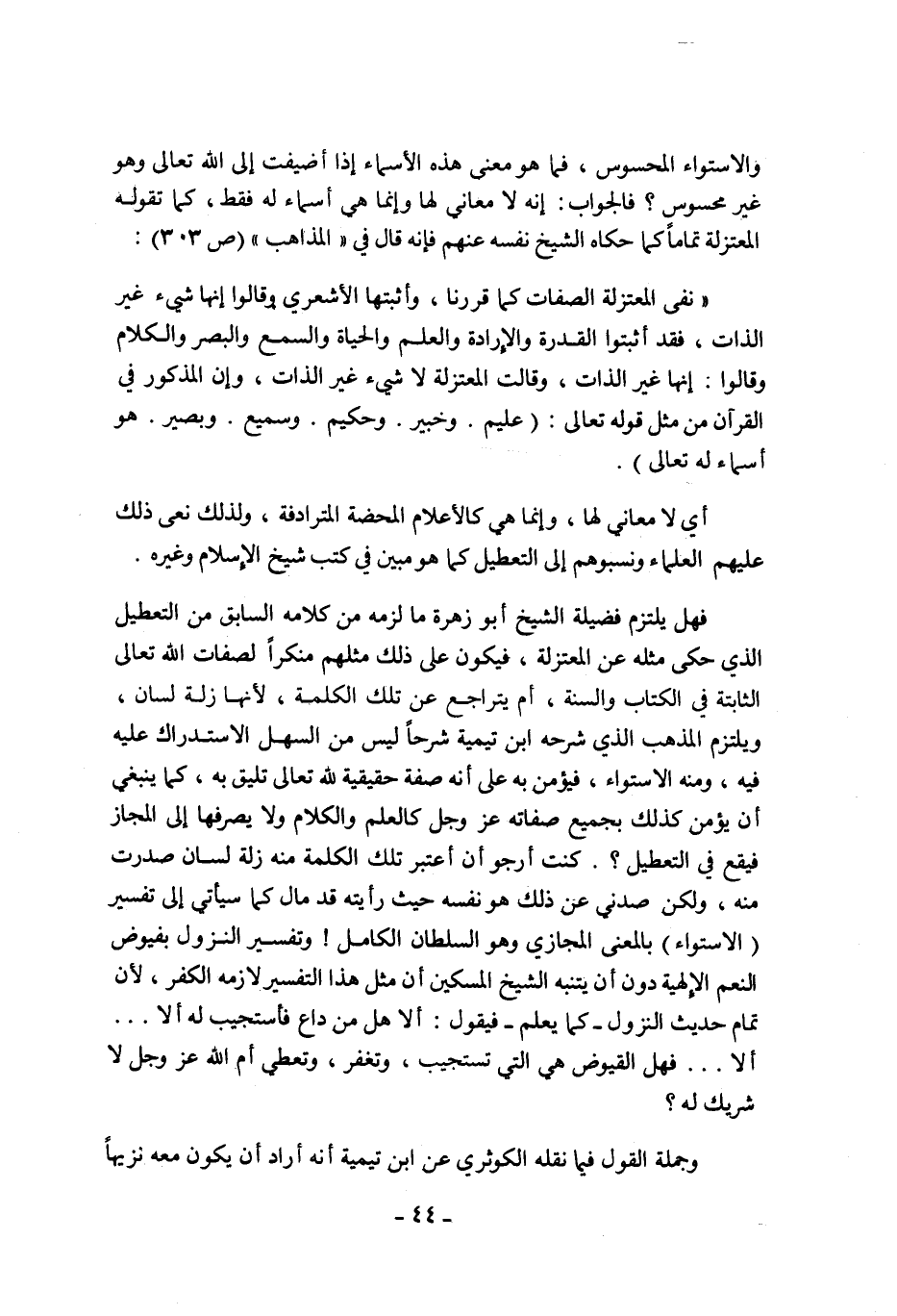 فهل يلتزم فضيلة الشيخ أبو زهرة ما لزمه من كلامه السابق من التعطيل الذي حكى مثله عن المعتزلة, فيكون على ذلك مثلهم منكرا لصفات الله تعالى الثابتة بالقرآن والسنة, أم يتراجع عن تلك الكلمة, لأنها زلة لسان, ويلتزم المذهب الذي شرحه ابن تيمية شرحا ليس من السهل الاستدراك عليه فيه, ومنه الاستواء, فيؤمن به على أنه صفة حقيقية لله تعالى تليق به كما ينبغي أن يؤمن كذلك بجميع صفاته عز وجل كالعلم والكلام ولا يصرفها إلى المجاز فيقع في التعطيل؟ كنت أرجو أن أعتبر تلك الكلمة منه زلة لسان صدرت منه ولكن صدني عن ذلك هو نفسه حيث رأيته قد مال كما سيأتي إلى تفسير "الاستواء" بالمعنى المجازي وهو السلطان الكامل وتفسير النزول بفيوض النعم الإلهية دون أن يتنبه الشيخ المسكين أن مثل هذا التفسير لازمه الكفر لأن تمام حديث النزول -كما يعلم- فيقول: ألا هل من داع فاستجيب له ألا ... ألا ... فهل القيوض هي التي تستجيب, وتغفر, وتعطي أم الله عز وجل لا شريك له؟
