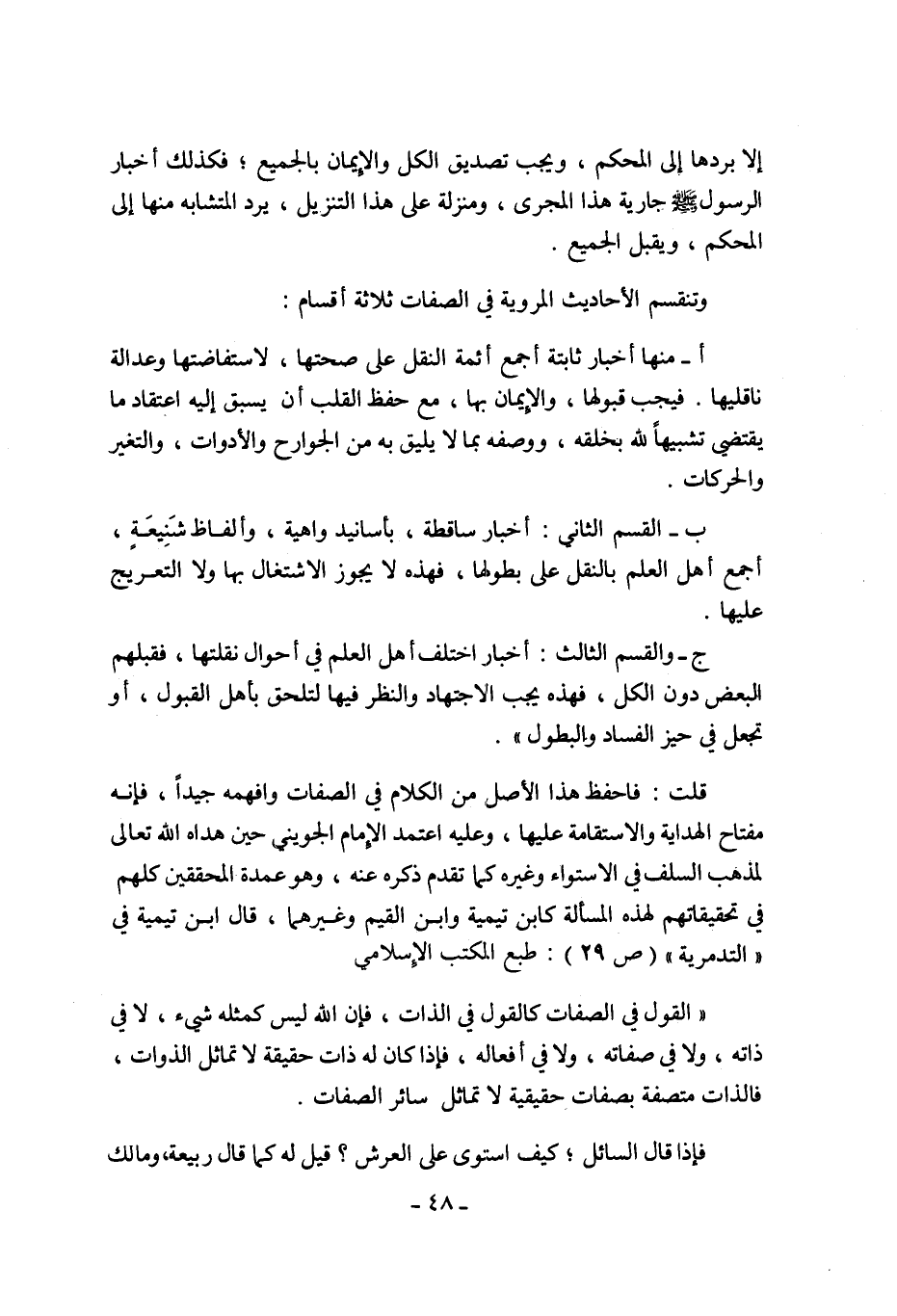 قلت: فاحفظ هذا الأصل من الكلام في الصفات وافهمه جيدا, فإنه مفتاح الهداية والاستقامة عليها, وعليه اعتمد الإمام الجويني حين هداه الله تعالى لمذهب السلف في الاستواء وغيره كما تقدم ذكره عنه, وهو عمدة المحققين كلهم في تحقيقاتهم لهذه المسألة كابن تيمية وابن القيم وغيرهما, قال ابن تيمية في "التدمرية" "ص29": طبع المكتب الإسلامي: