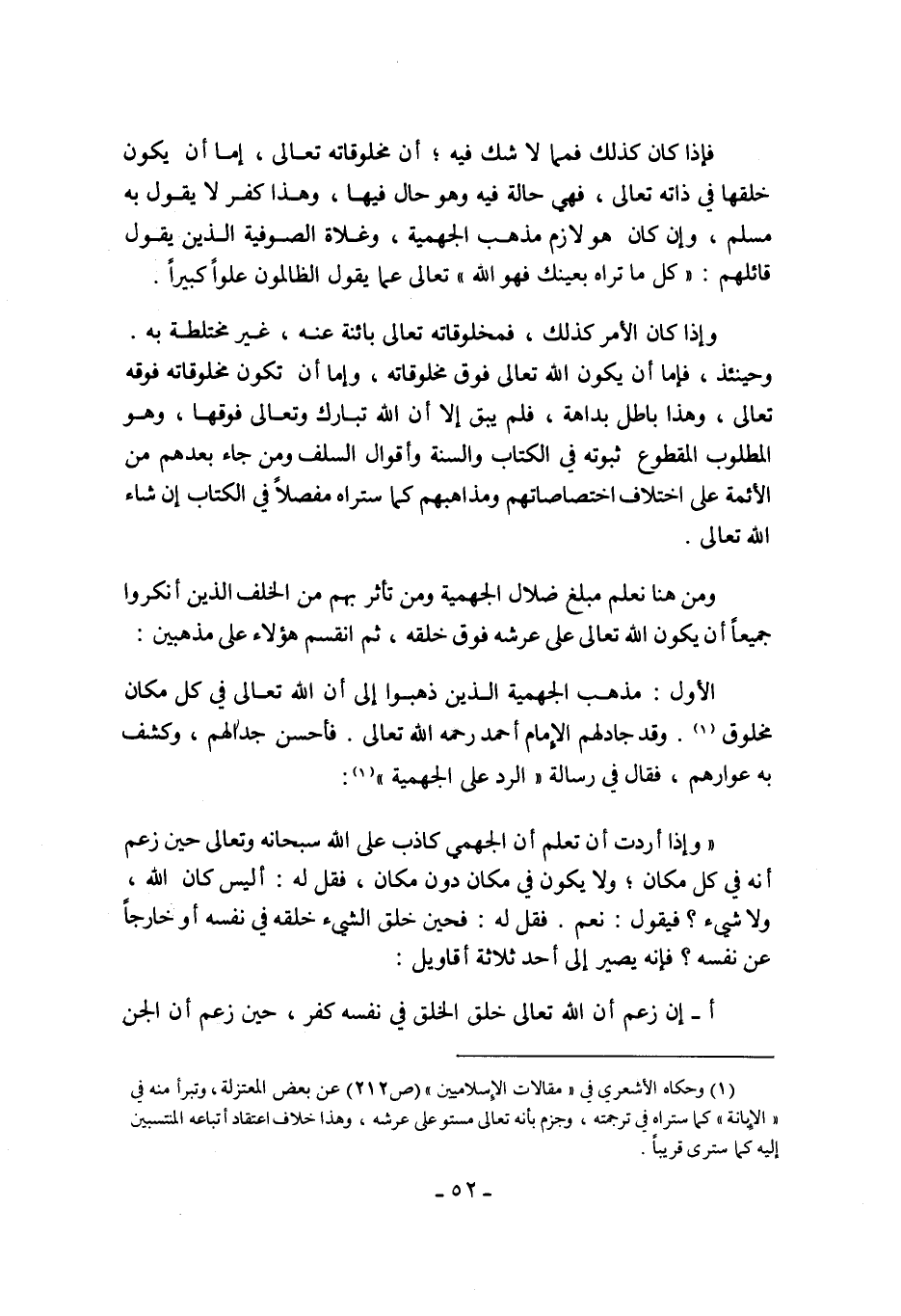 الأول: مذهب الجهمية الذين ذهبوا إلى أن الله تعالى في كل مكان مخلوق 1. وقد جادلهم الإمام أحمد رحمه الله تعالى. فأحسن جدالهم