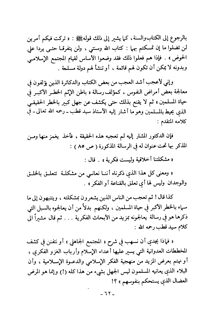 كذا قال! ثم تعجب من الناس الذين يشعرون بمشكلته, ويتنبهون إلى ما سماه بالخطر الأكبر في حياة المسلمين, ولكنهم بدلا من أن يعالجوه بالسبل التي ذكرها هو في رسالة يعالجونه بمزيد من الأبحاث الفكرية ... ثم قال مشيرا إلى كلام سيد قطب رحمه الله: