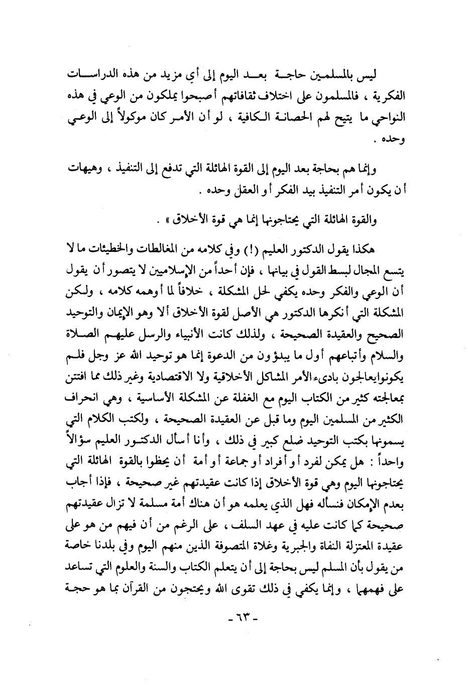 هكذا يقول الدكتور العليم "! " وفي كلامه من المغالطات والخطيئات ما لا يتسع المجال لبسط القول في بيانها, فإن أحدا من الإسلاميين لا يتصور أن يقول أن الوعي والفكر وحده يكفي لحل المشكلة, خلافا لما أوهمه كلامه, ولكن المشكلة التي أنكرها الدكتور هي الأصل لقوة الأخلاق ألا وهو الإيمان والتوحيد الصحيح والعقيدة الصحيحة, ولذلك كانت الأنبياء والرسل عليهم الصلاة والسلام وأتباعهم أول ما يبدؤون من الدعوة إنما هو توحيد الله عز وجل, فلم يكونوا يعالجون بادئ الأمر المشاكل الأخلاقية ولا الاقتصادية وغير ذلك مما افتتن بمعاجلته كثير من الكتاب اليوم مع الغفلة عن المشكلة الأساسية, وهي انحراف الكثير من المسلمين اليوم وما قبل عن العقيدة الصحيحة, ولكتب الكلام التي يسمونها بكتب التوحيد ضلع كبير في ذلك, وأنا أسأل الدكتور العليم سؤالا واحدا: هل يمكن لفرد أو أفراد أو جماعة أو أمة أن يحظوا بالقوة الهائلة التي يحتاجونها اليوم وهي قوة الأخلاق إذا كانت عقيدتهم غير صحيحة فإذا أجاب بعدم الإمكان فنسأله فهل الذي يعلمه هو أن هناك أمة مسلمة لا تزال عقيدتهم صحيحة, كما كانت عليه في عهد السلف على الرغم من أن فيهم من هو على عقيدة المعتزلة النفاة والجبرية وغلاة المتصوفة الذي منهم اليوم, وفي بلدنا خاصة من يقول بأن المسلم ليس بحاجة إلى أن يتعلم الكتاب والسنة والعلوم التي تساعد على فهمهما, وإنما يكفي في ذلك تقوى الله ويحتجون من القرآن بما هو حجة