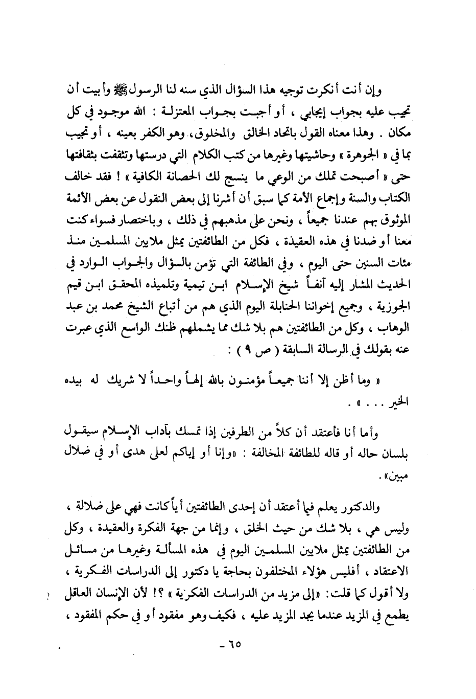 المشار إليه آنفا شيخ الإسلام ابن تيمية وتلميذه المحقق ابن قيم الجوزية, وجميع إخواننا الحنابلة اليوم الذي هم من أتباع الشيخ محمد بن عبد الوهاب, وكل من الطائفتين هم بلا شك مما يشملهم ظنك الواسع الذي عبرت عنه بقولك في الرسالة السابقة "ص9":