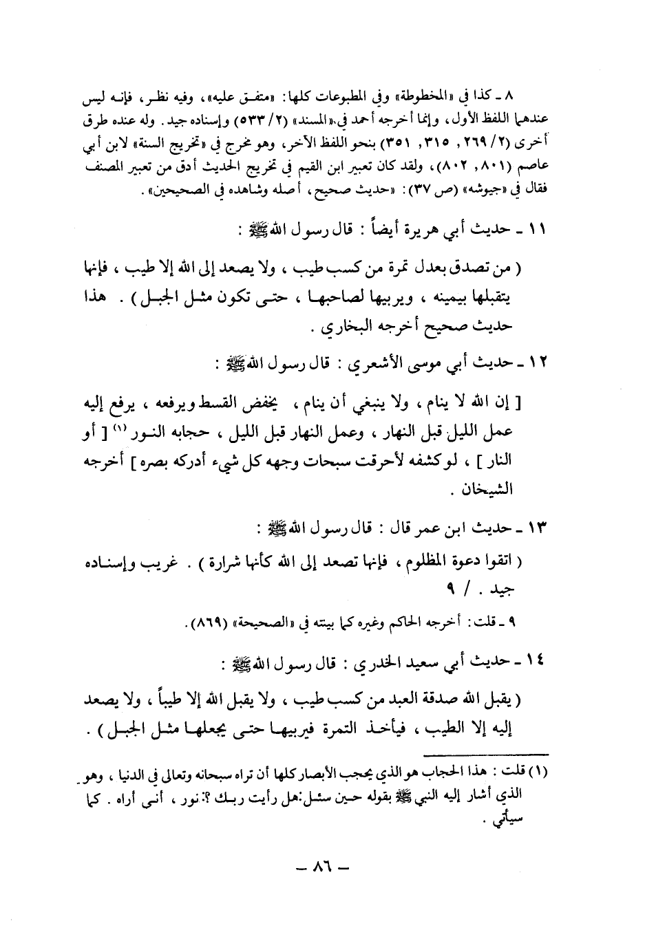 14- حديث أبي سعيد الخدري: قال قال رسول الله صلى الله عليه وَسَلَّمَ: "يَقْبَلُ اللَّهُ صَدَقَةَ الْعَبْدِ مِنْ كَسْبٍ طَيِّبٍ, وَلا يَقْبَلُ الله إِلا طَيِّبًا, وَلا يَصْعَدُ إِلَيْهِ إلا الطيب, فَيَأْخُذُ التَّمْرَةَ فَيُرَبِّيهَا حَتَّى يَجْعَلَهَا مثل الجبل".
