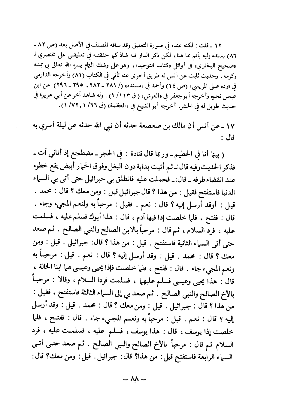 12- قلت: لكنه عنده في صورة التعليق وقد ساقه المصنف في الأصل بعد "ص82-86" بسنده إليه بأتم مما هنا، لكن ذكر الدار فيه شاذ كما حققته في تعليقي على مختصري لـ"صحيح البخاري" في أوائل "كتاب التوحيد"، وهو على وشك التمام يسره الله تعالى لي يمنه وكرمه. وحديث ثابت عن أنس له طريق أخرى عنه تأتي في الكتاب "81" وأخرجه الدارمي في "رده على المريسي" "ص14" وأحمد في "مسنده" " / 281-282، 295-296" عن ابن عباس ونحوه وأخرجه أبو جعفر في "العرش" "ق113/ 1". وله شاهد آخر عن أبي هريرة في حديث طويل له في الحشر. أخرجه أبو الشيخ في "العظمة" "ق66/ 1، 72/ 1".