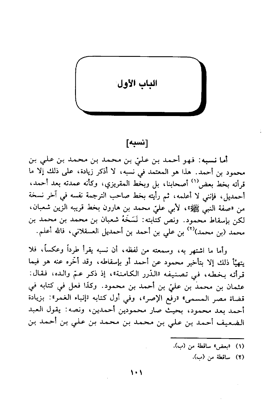 وأما ما اشتهر به، وسمعته من لفظه، أن نسبه يقرأ طردًا وعكسًا، فلا يتهيَّأ ذلك إلا بتأخير محمود عن أحمد أو بإسقاطه، وقد أخّره عنه هو فيما قرأته بخطه، في تصنيفه "الدرّر الكامنة"، إذ ذكر عمّ والده، فقال: عثمان بن محمد بن عليّ بن أحمد بن محمود. وكذا فعل في كتابه في قضاة مصر المسمى" "رفع الإصر"، وفي أول كتابه "إنباء الغمر": بزيادة أحمد بعد محمود، بحيث صار محمودين أحمدين، ونصه: يقول العبد الضعيف أحمد بن علي بن محمد بن محمد بن علي بن أحمد بن